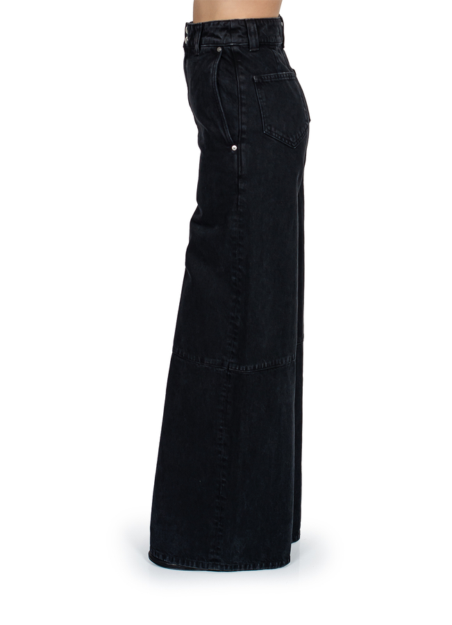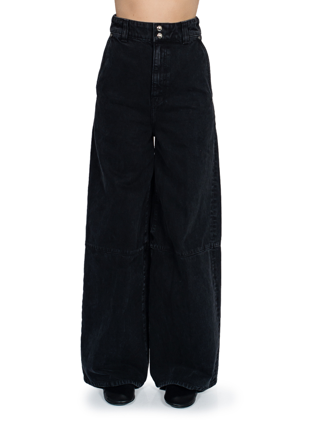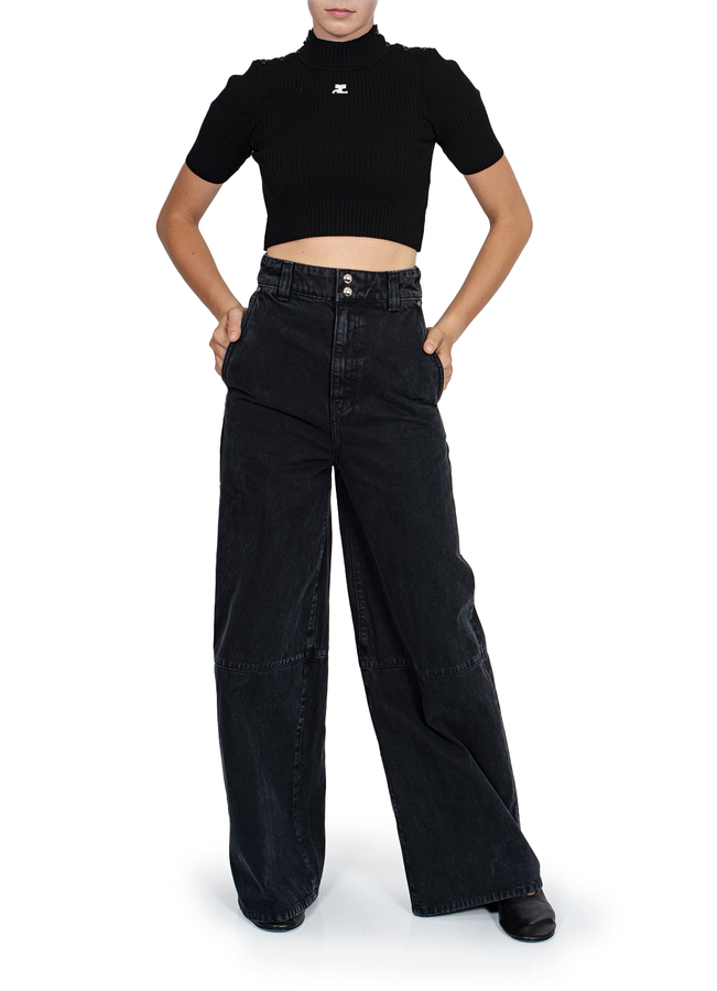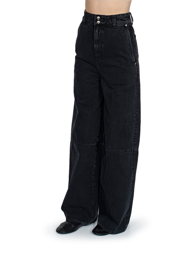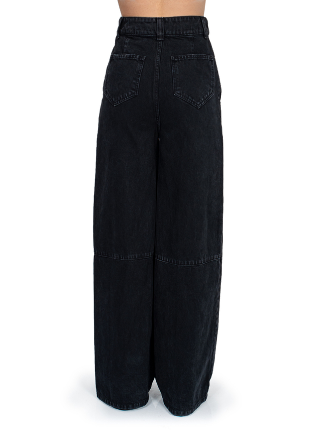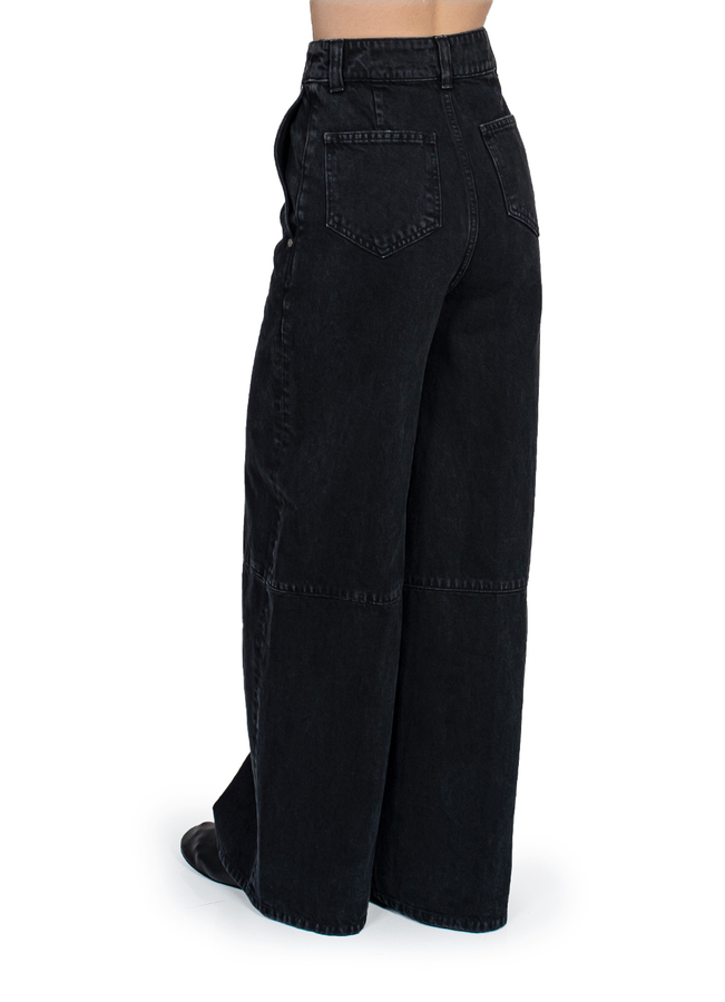 - Широкі джинси, на поясі шлевки для ременя, дві бокові прорізні кишені та дві накладні кишені ззаду, застібка на блискавку