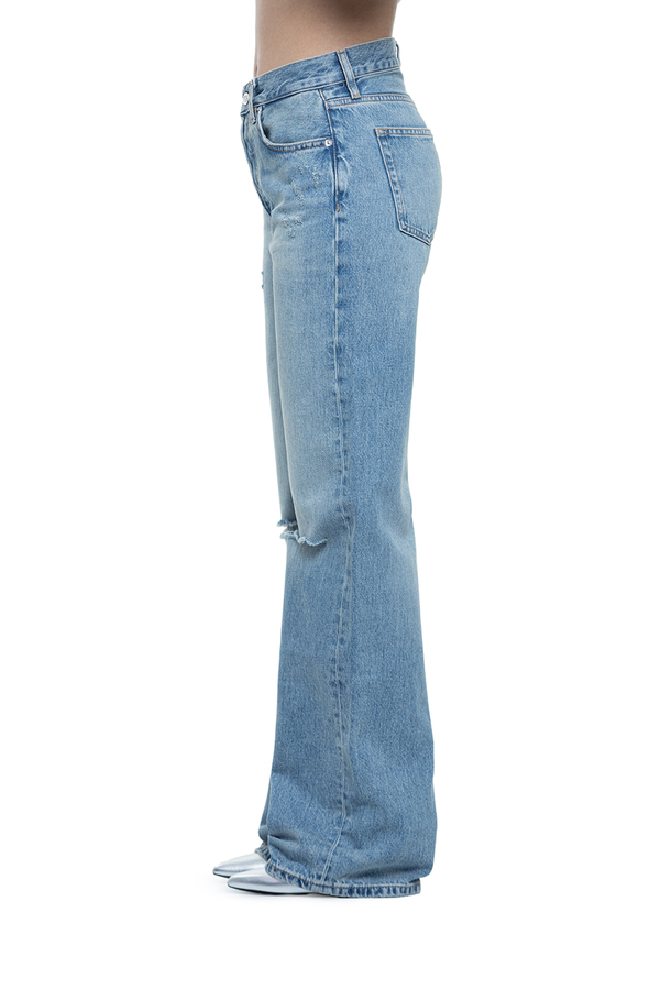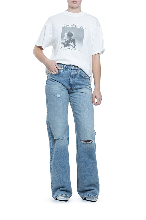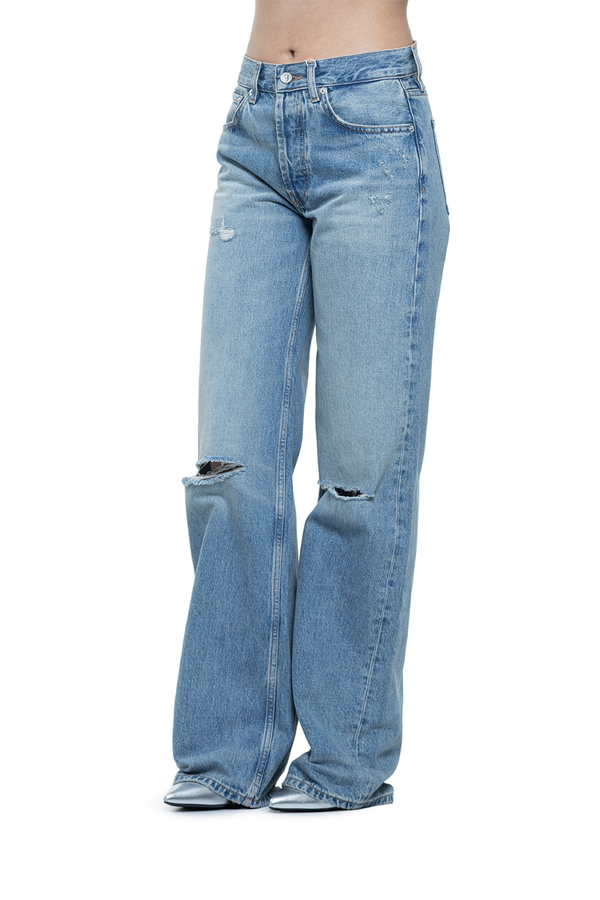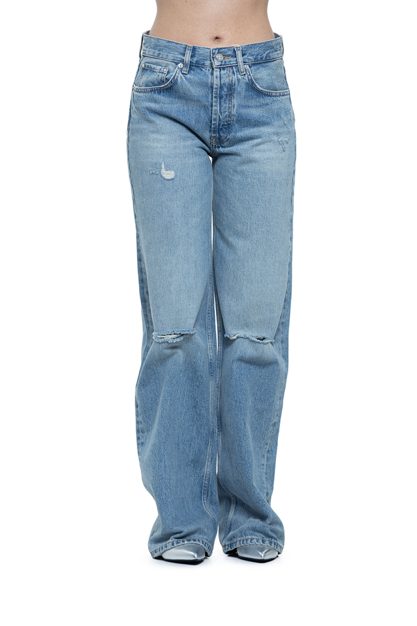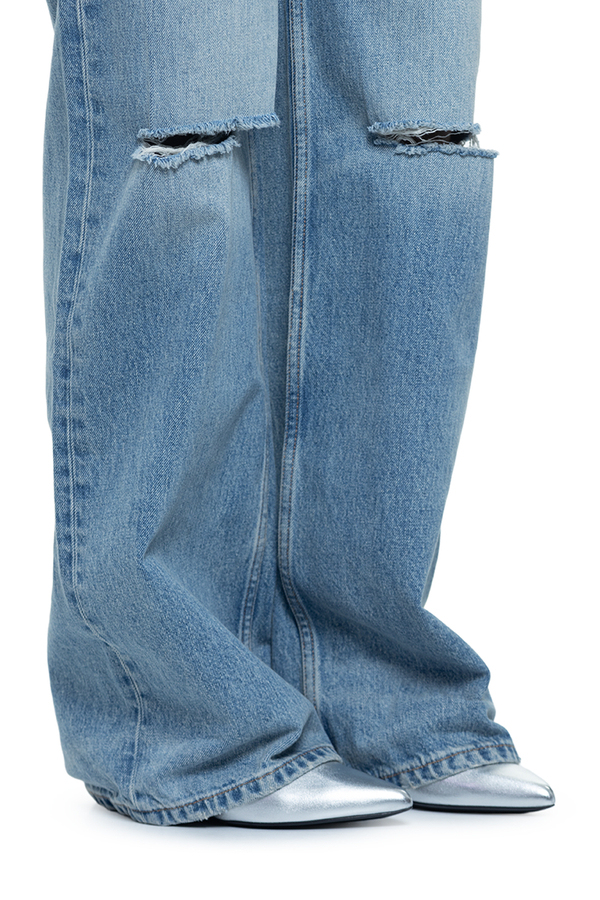 - Джинси вільного крою, декоровані дірками на колінах, класичні п’ять кишень, ефект потертості, петлі для ременя, контрастна шкіряна вставка з монограмою ззаду