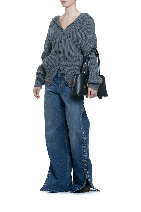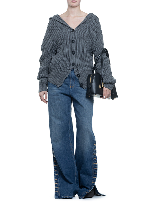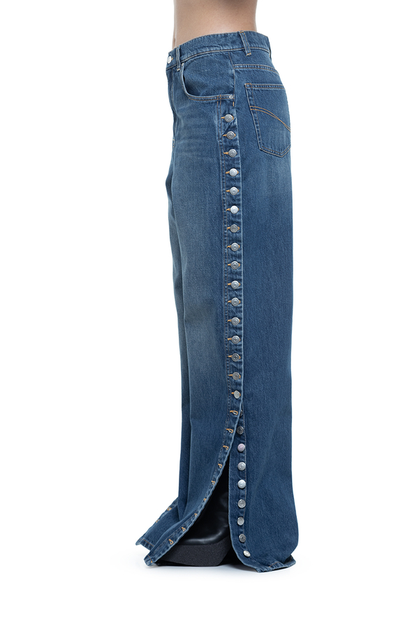 - Широкі джинси з класичними п’ятьма кишенями, петлі для ременя, контрастні шви, застібка на блискавку та гудзик спереду, ефектний ряд гудзиків з логотипом вздовж зовнішніх бокових швів