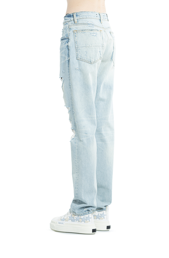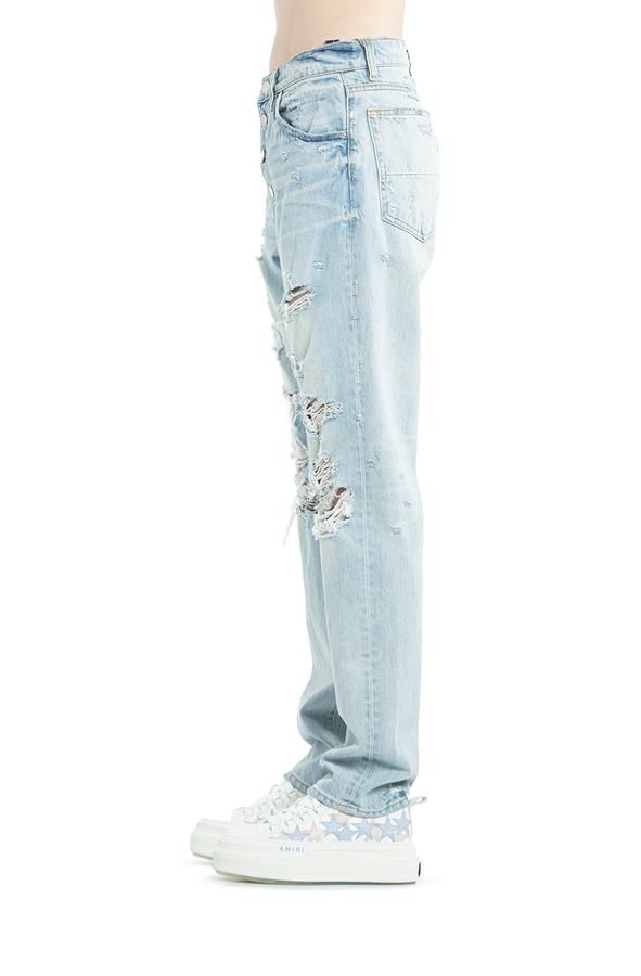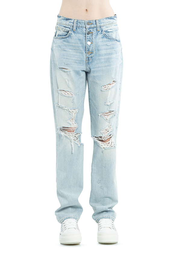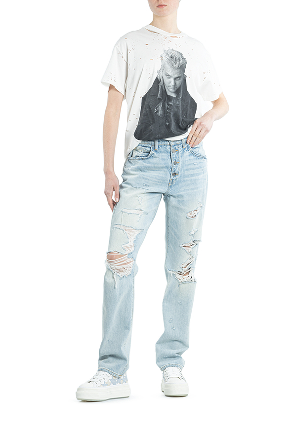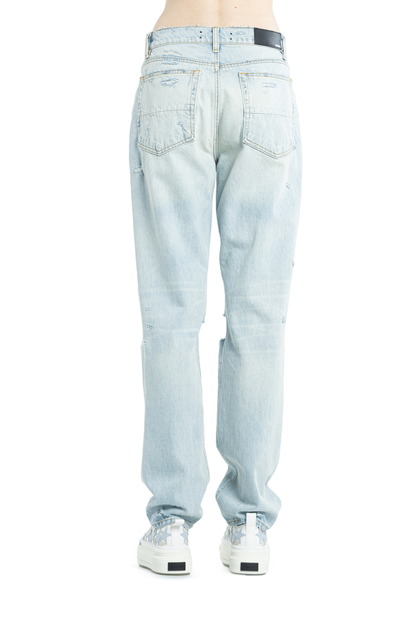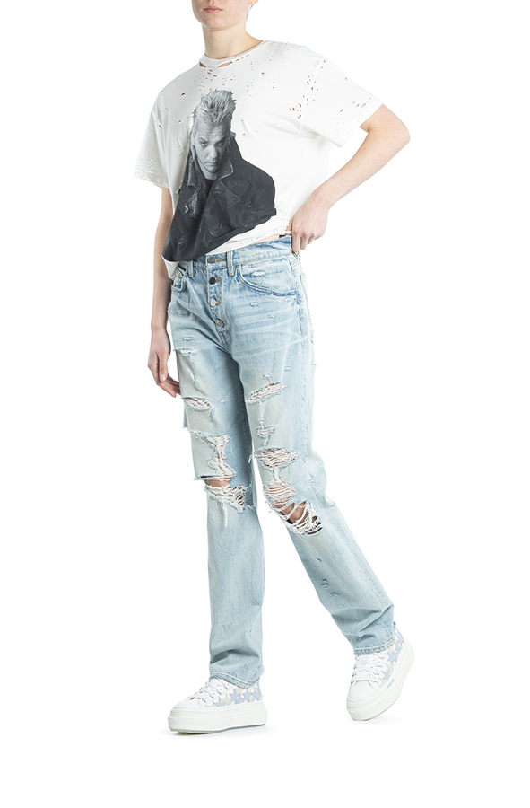 - Джинси з декоративними пошкодженнями і високою лінією талії. Застібки на гудзики та приховану блискавку спереду. Аплікація- логотип позаду. Кльош від коліна. П'ять кишень.