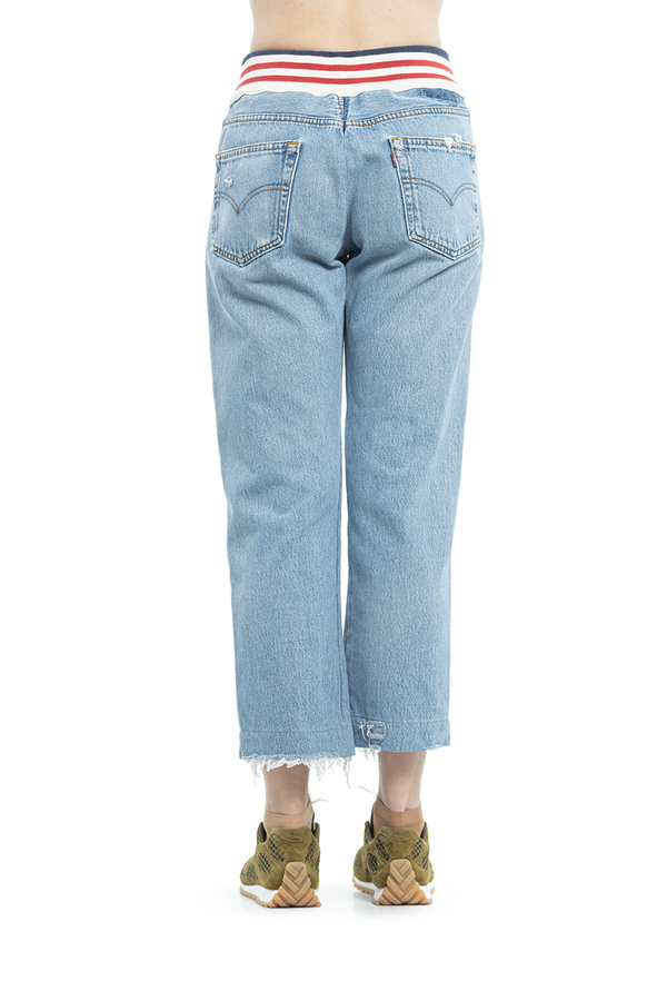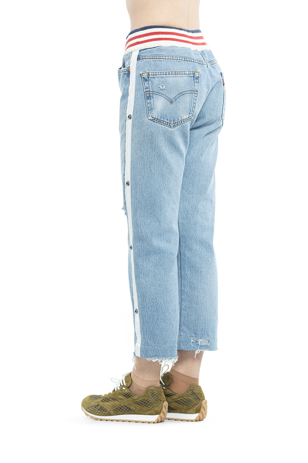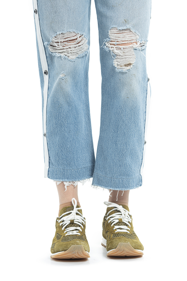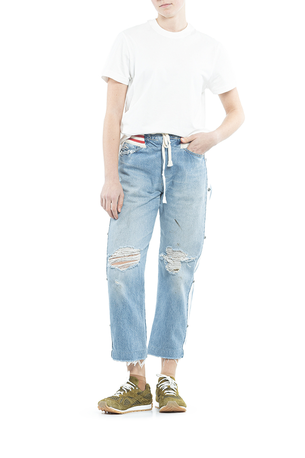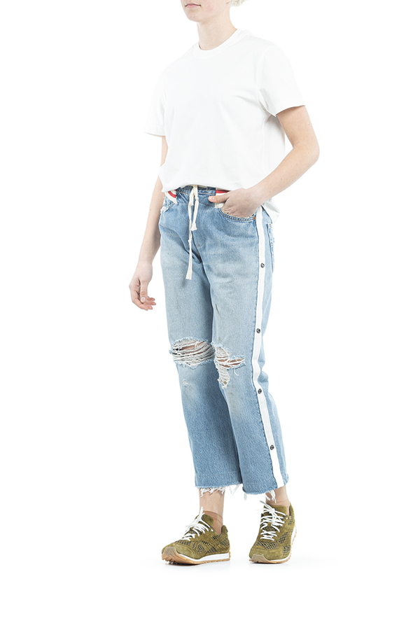- Джинси широкого крою з рваними декоративними пошкодженнями. На еластичному поясі в смудку. Прикрашені білими лампасами на кнопках.