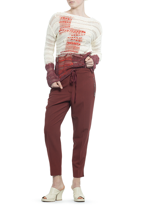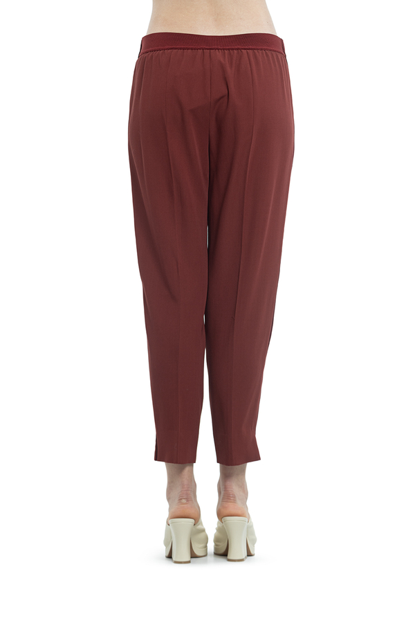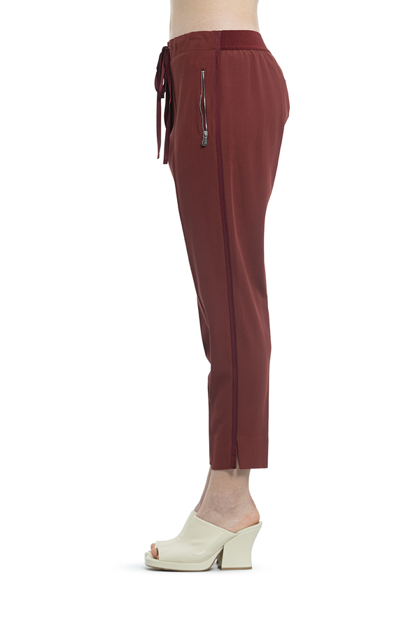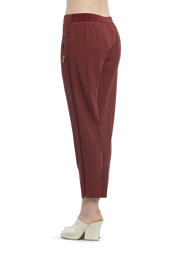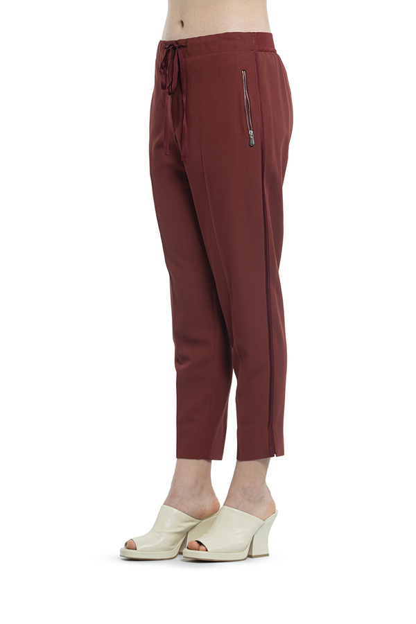 - Штани прямого крою з лампасами з боків. На широкому поясі з куліскою. Укороченої довжини, класичної посадки, з бічними прорізними кишенями на блискавках.