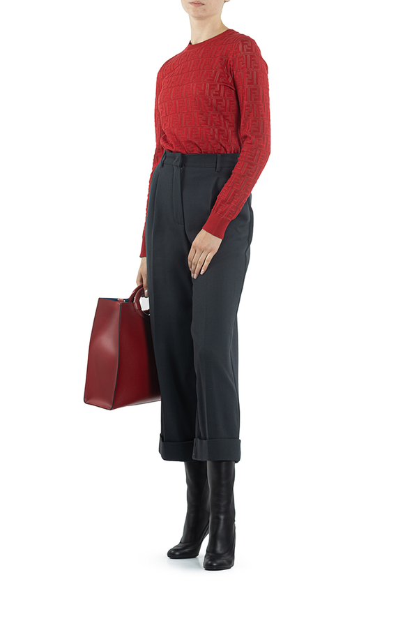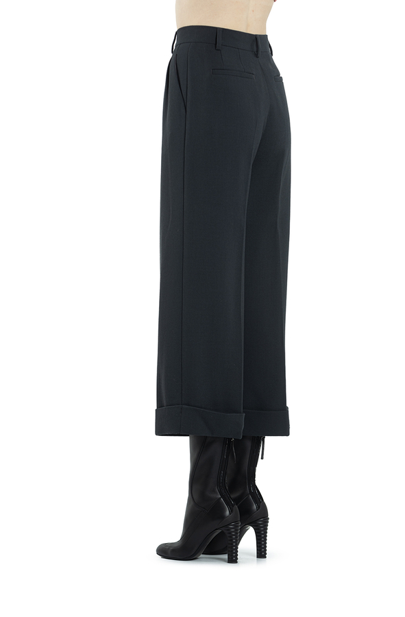 - Штани широкого крою зі складками, на поясі з петлями для ремня. Застібка на гачок і блискавку. Підгорнуті манжети знизу. Ззаду дві прорізні кишені.