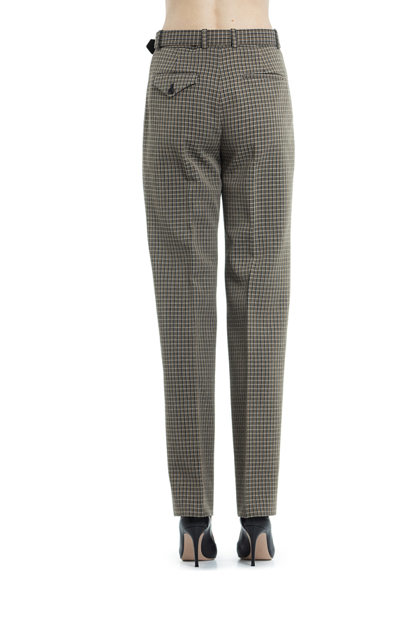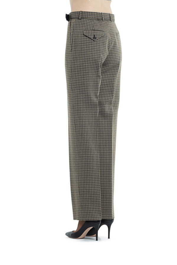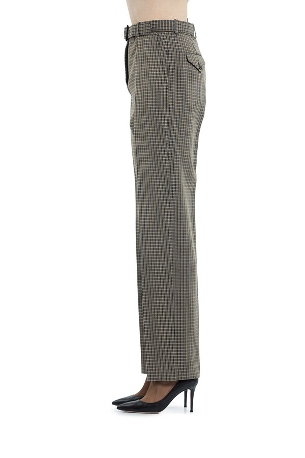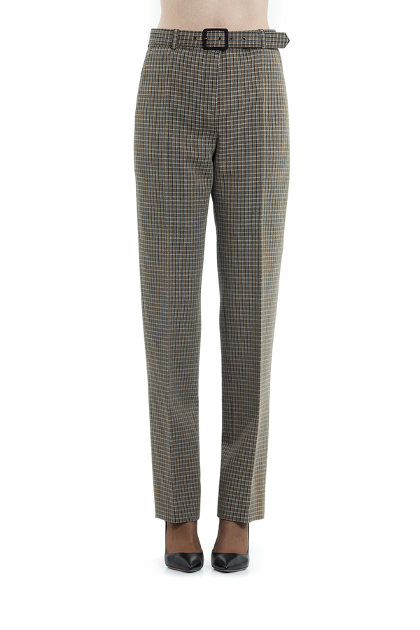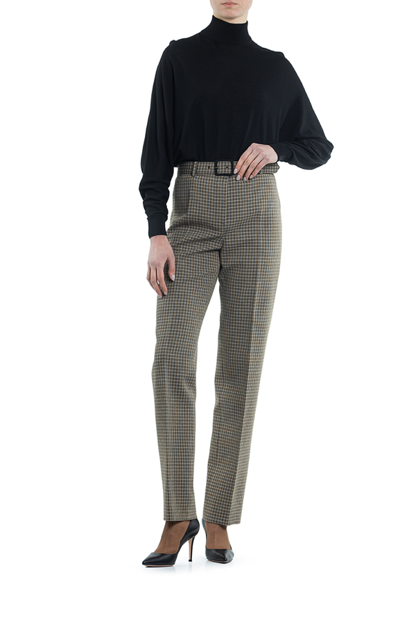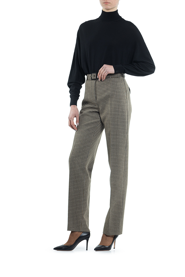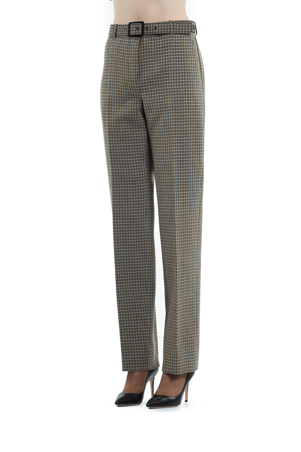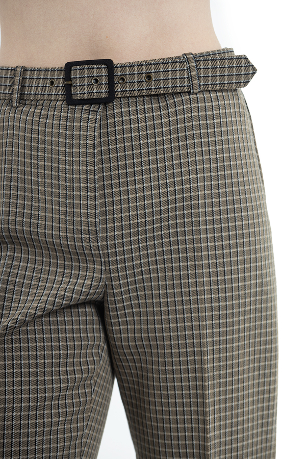 - Штани прямого крою в дрібну клітинку на поясі. Застібка на блискавку і на ремень з пряжкою.