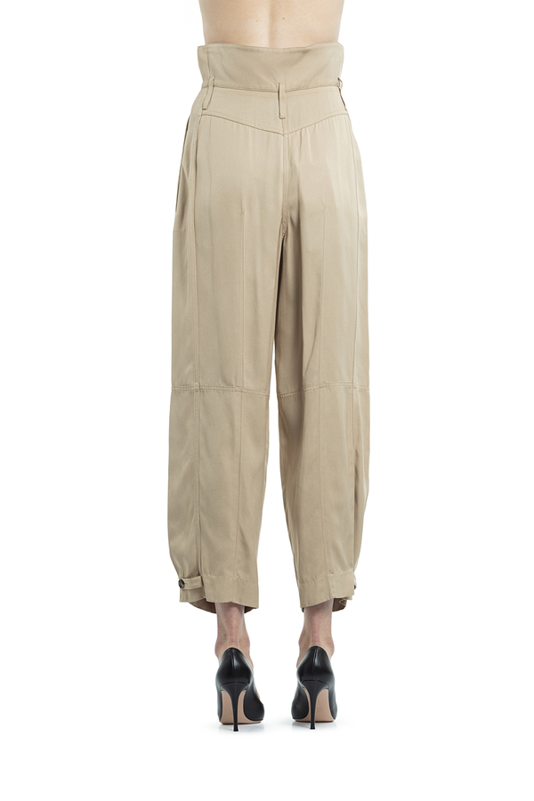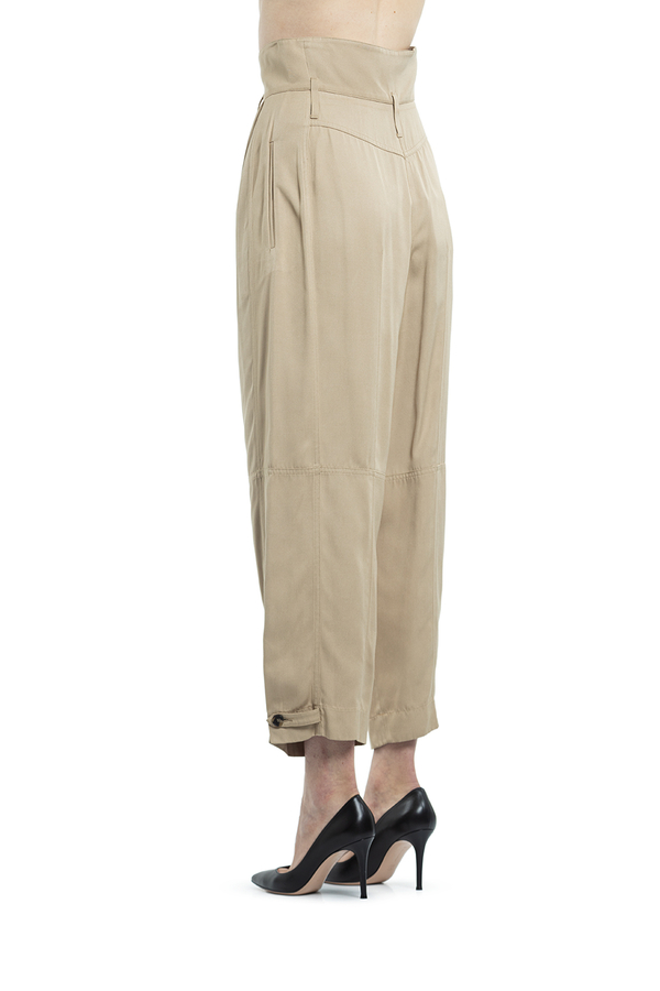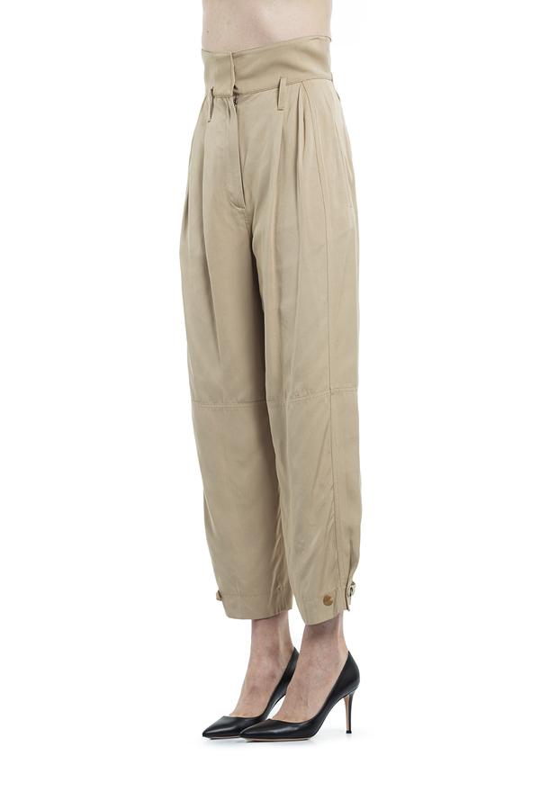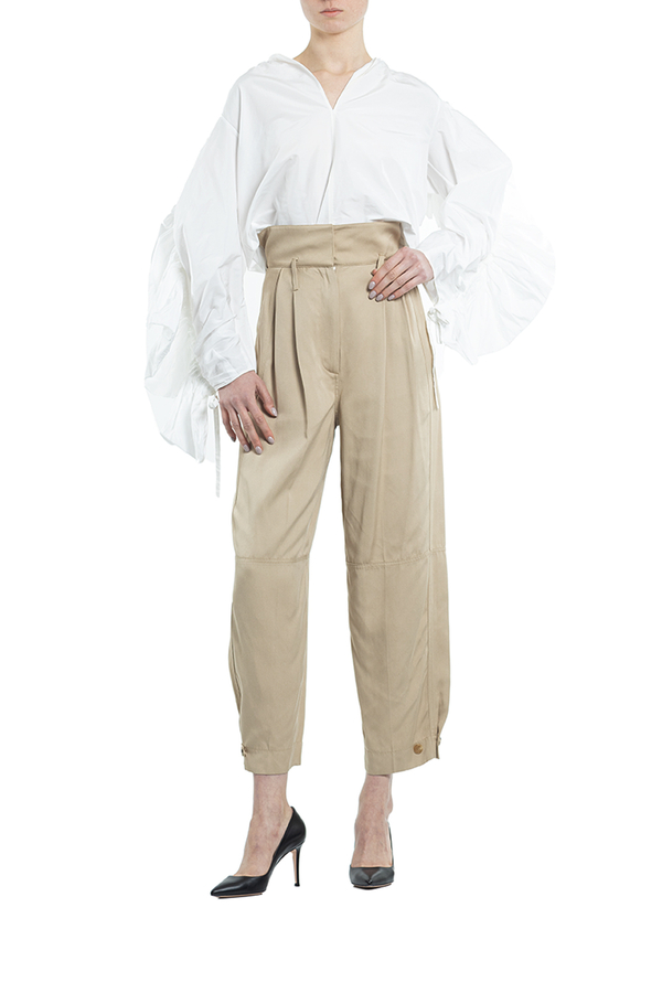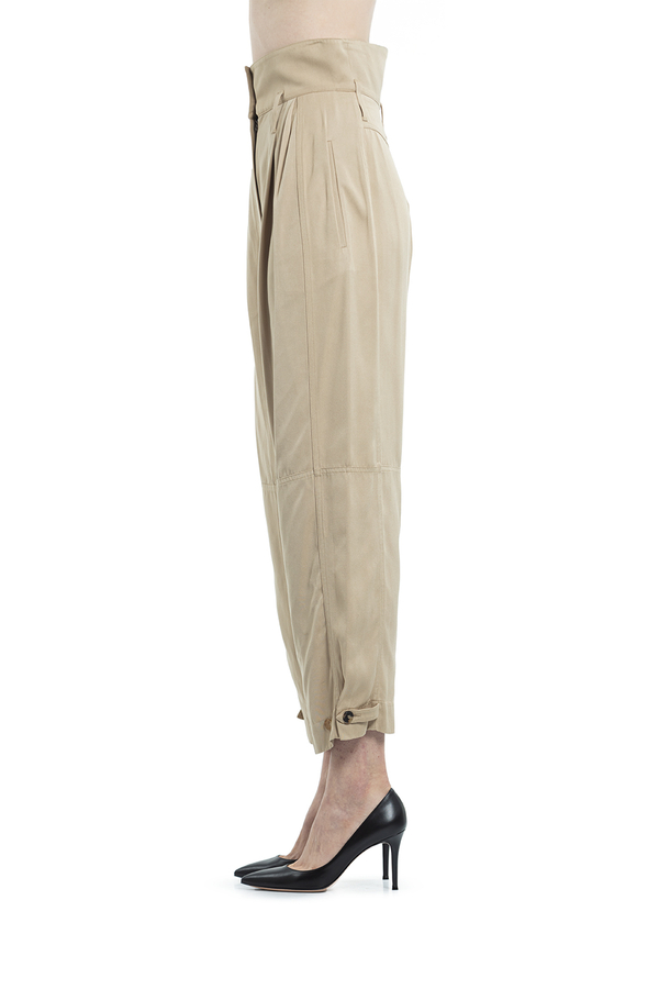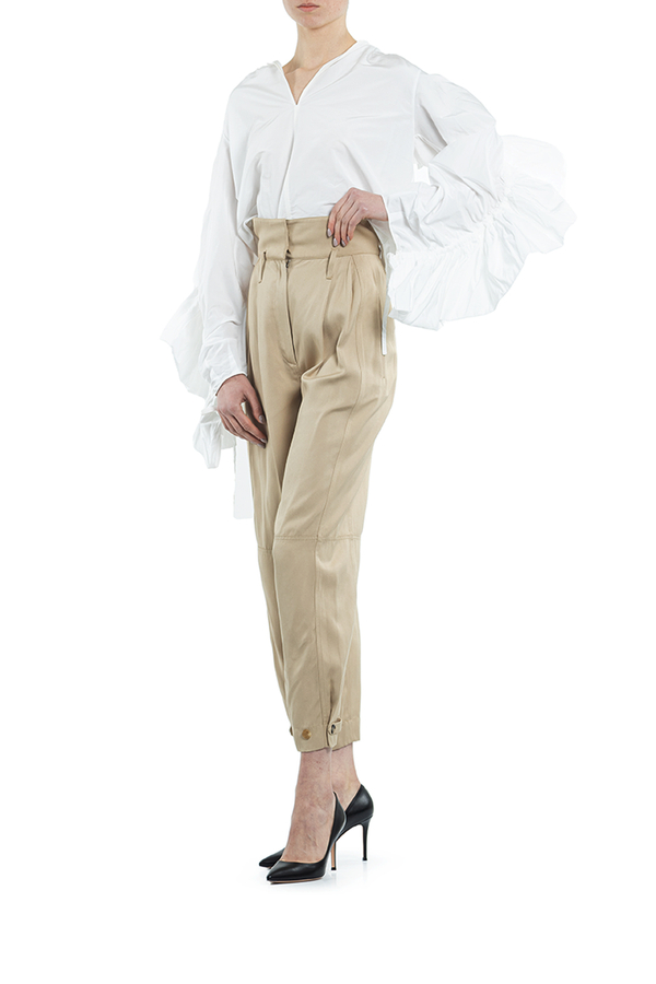 - Штани з високою посадкою, дві прорізні кишені з боків. Петлі для ременя, внизу застібка на гудзики