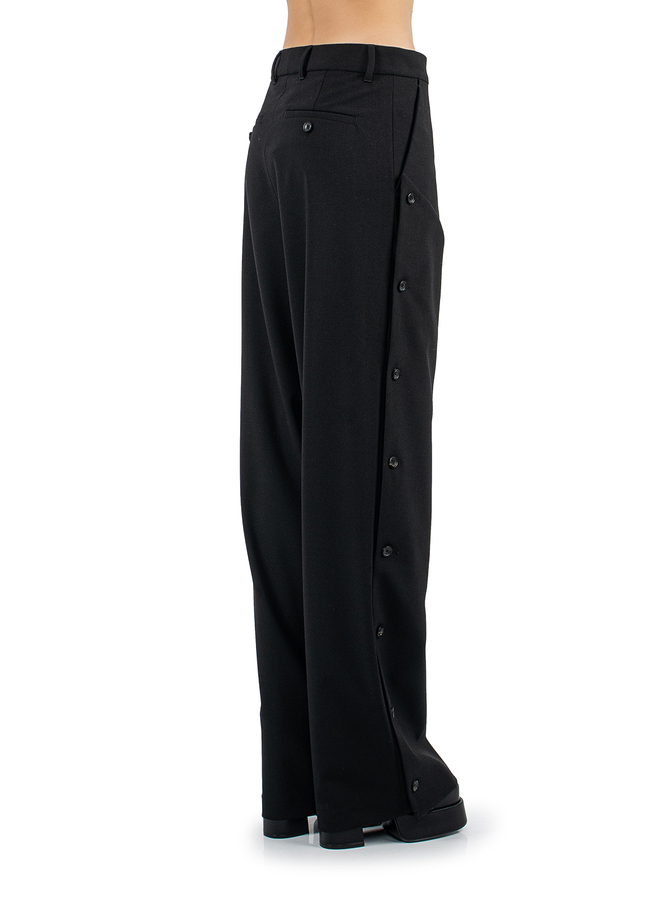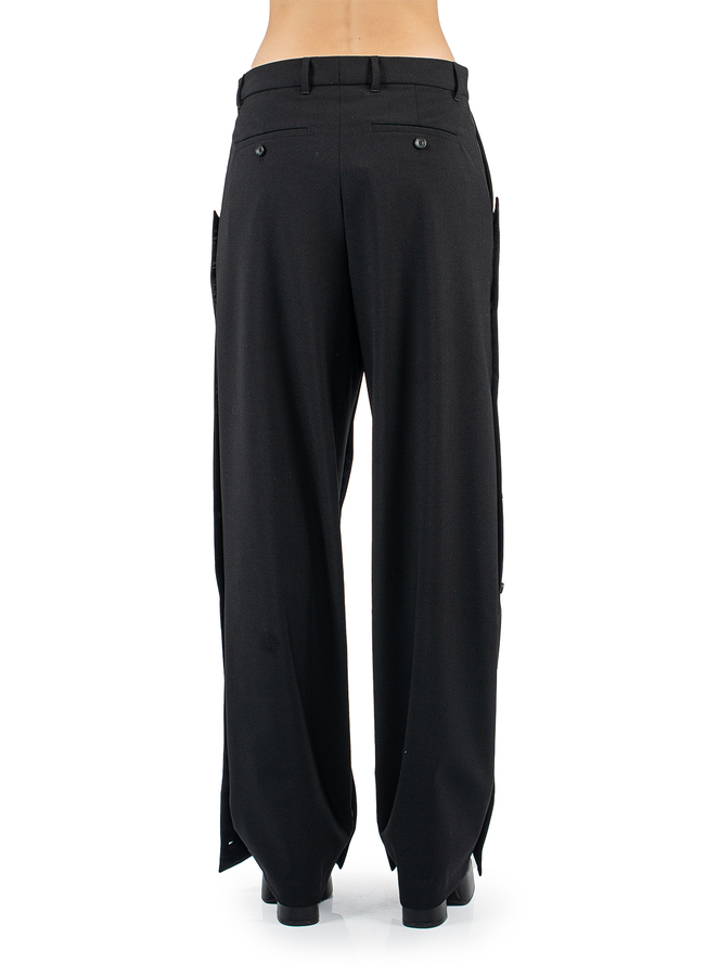 - Штани прямі, спереду накладні деталі, прикріплені до штанин гудзиками, по дві прорізні кишені по боках і ззаду