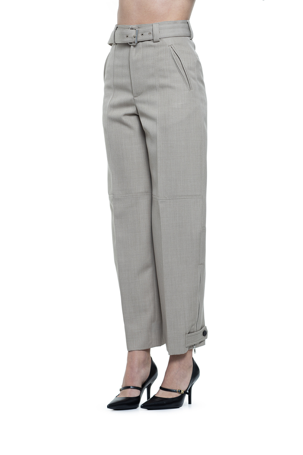 - Звужені штани, укорочені біля щиколотки, висока посадка, манжети на гудзиках та блискавці, застібка на гачок та блискавку, петлі для ременя, бічні подвійні прорізні кишені під кутом, задні подвійні прорізні кишені з трикутним фірмовим елементом