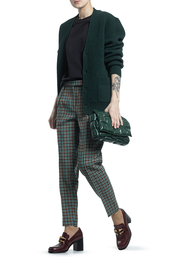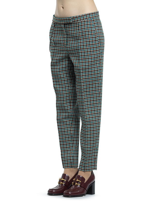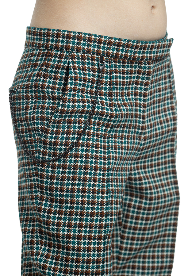- Картаті штани прямого крою прикрашені ланцюжком.