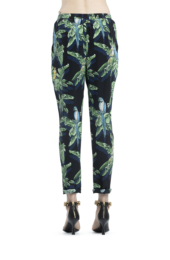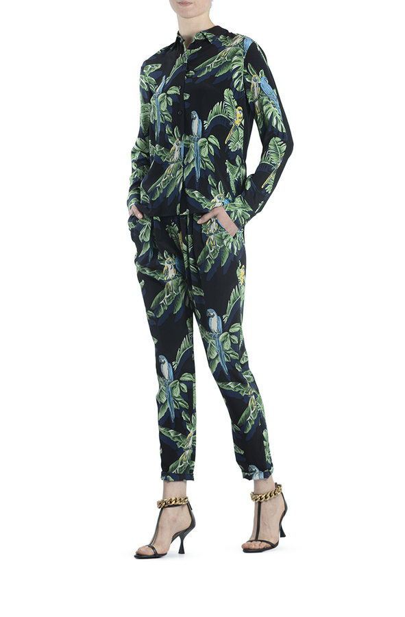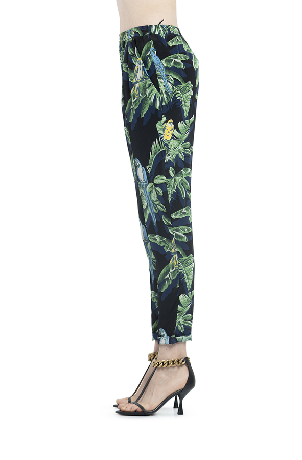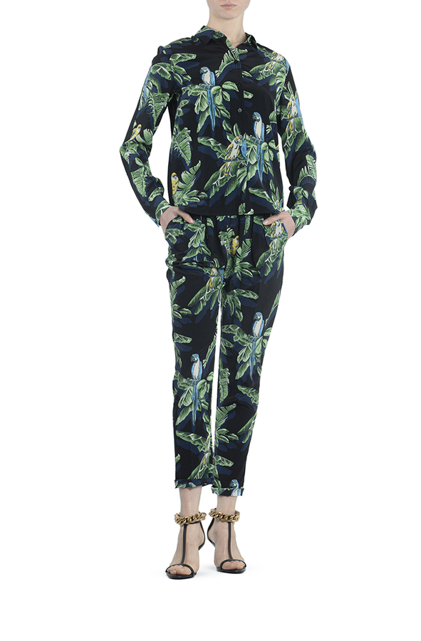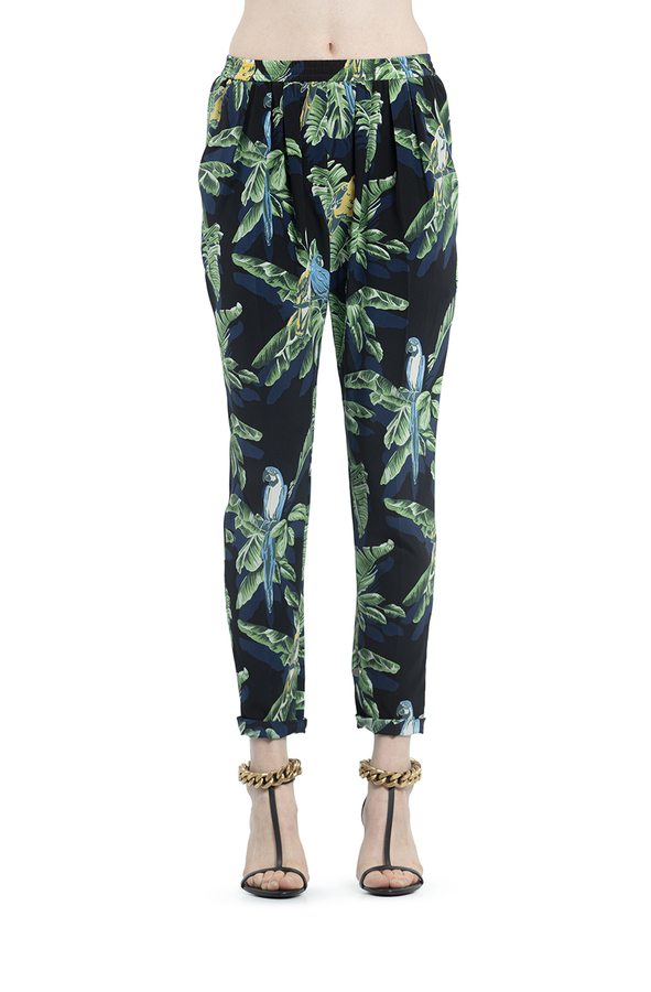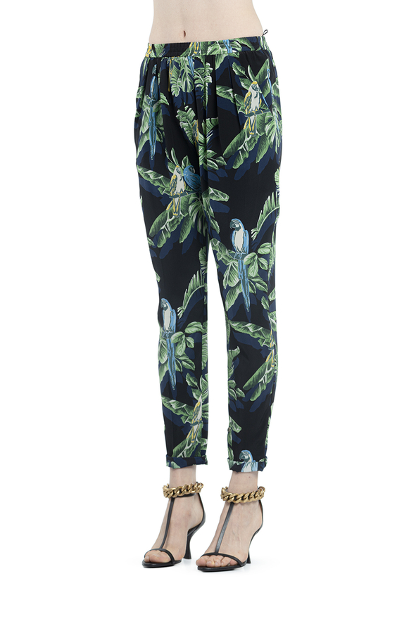 - Шовкові штани прямого крою з принтом лисття і папуг. Високий, звужений, еластичний пояс, накладні кишені спереду.