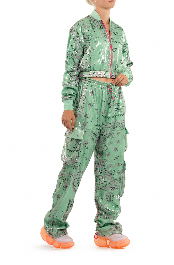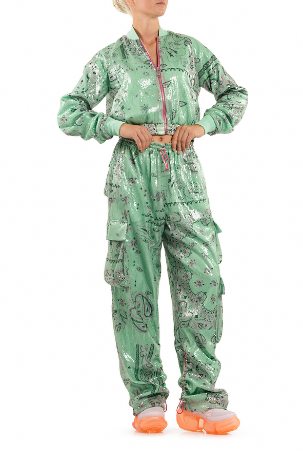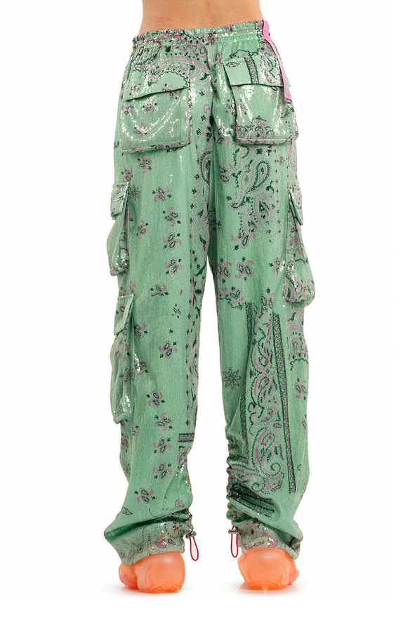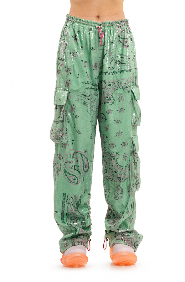 - Штани-карго, прикрашені паєтками, дві бічні прорізні кишені, декілька кишень-карго по боках та ззаду, еластичний пояс та манжети на кулісі