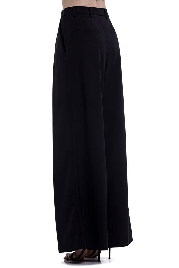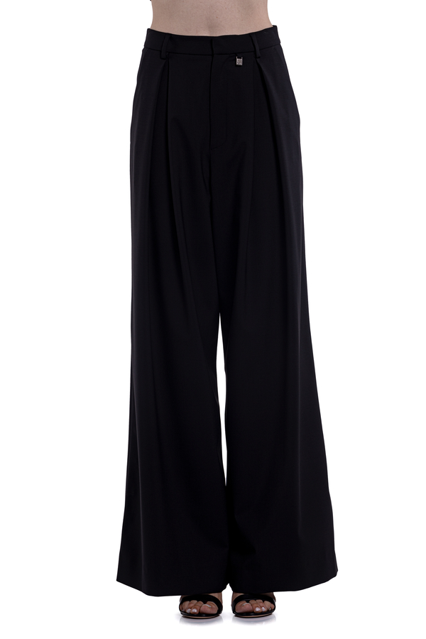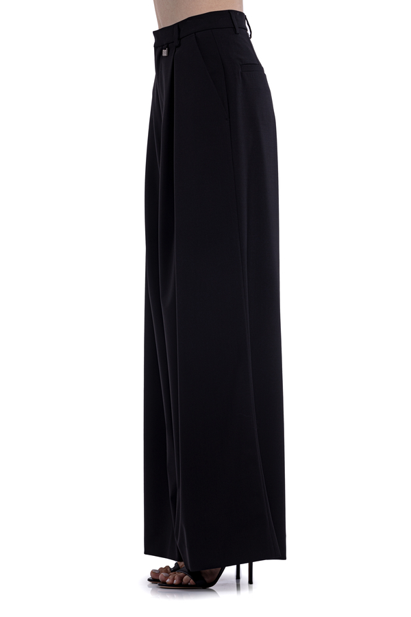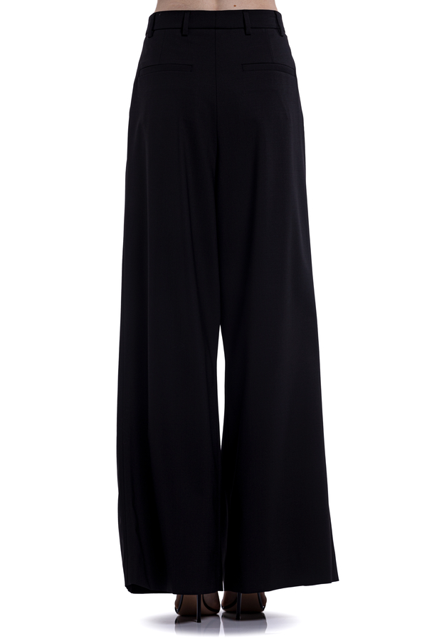 - Вовняні брюки-кльош, шлевки на талії, табличка з логотипом спереду, деталізація плісе, дві бічні прорізні кишені, потайний передній ґудзик і блискавка