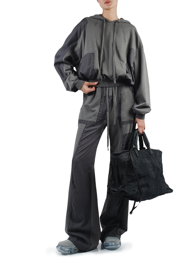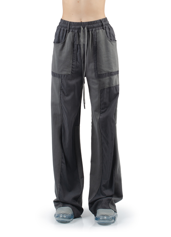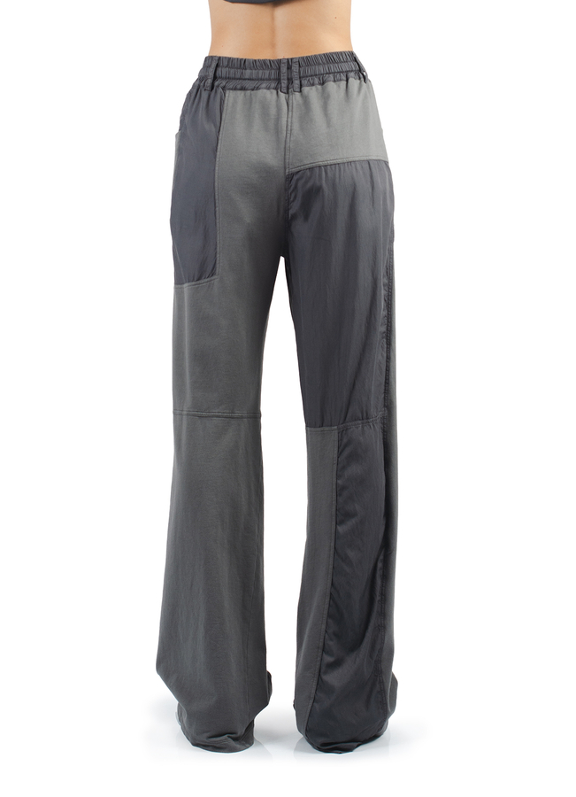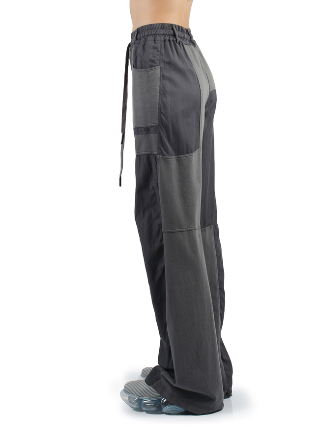 - Широкі штани зі вставками, еластичний пояс на шнурку, петлі для ременя, спереду дві накладні кишені