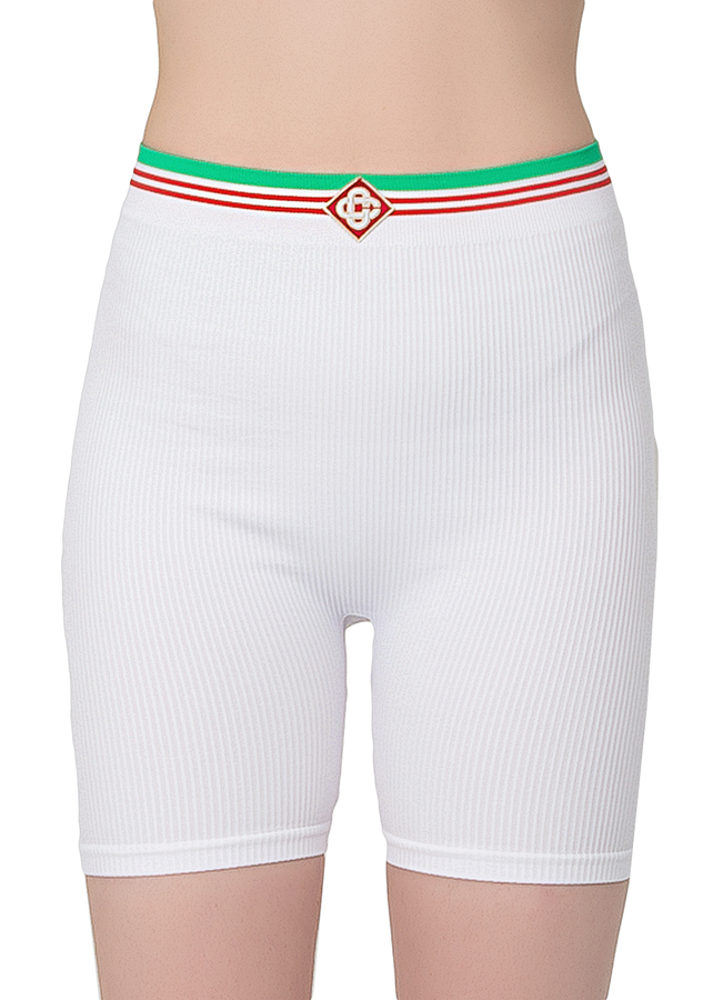 - Білі безшовні трикотажні шорти в рубчик від Casablanca із зелено-червоною смужкою на високій талії, логотипом і приталеним силуетом.