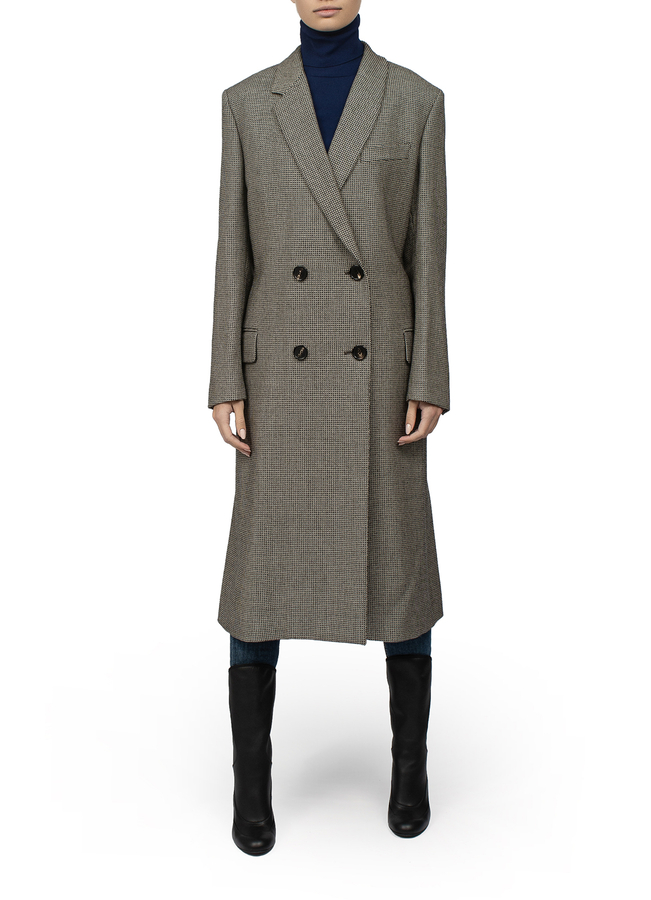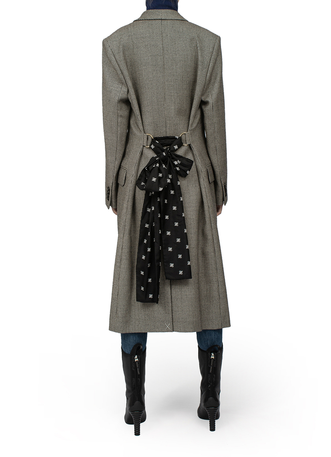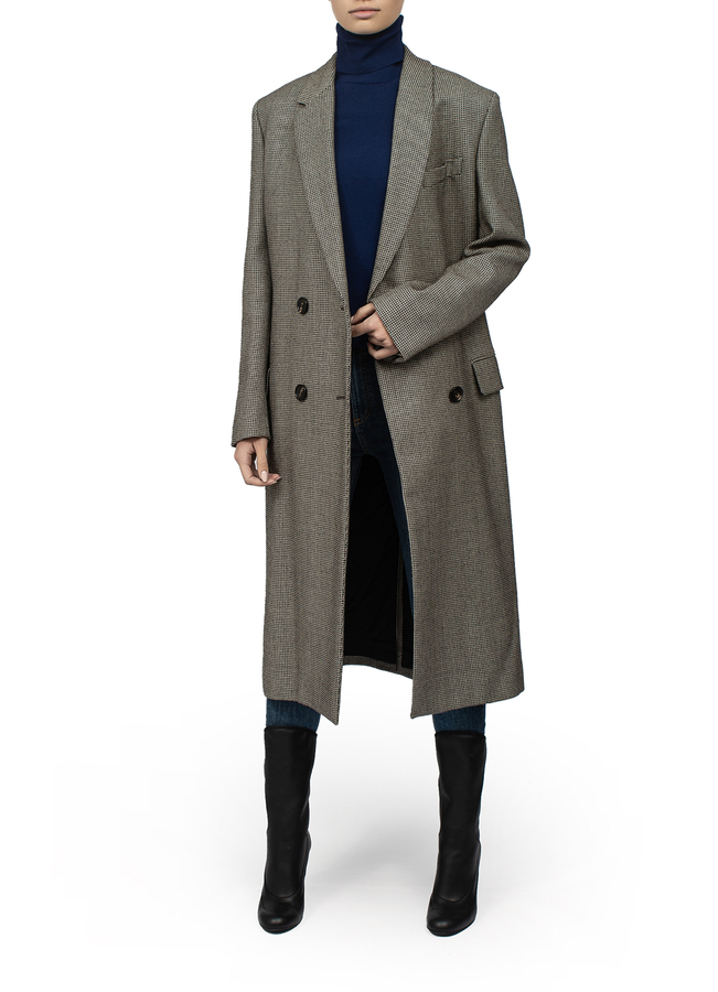 - Довге пальто з поясом-стрічкою з логотипами. Прорізні кишені з клапанами з боків. Застібка на гудзиках, відкладний комір з прорізами. Гудзики на манжетах.