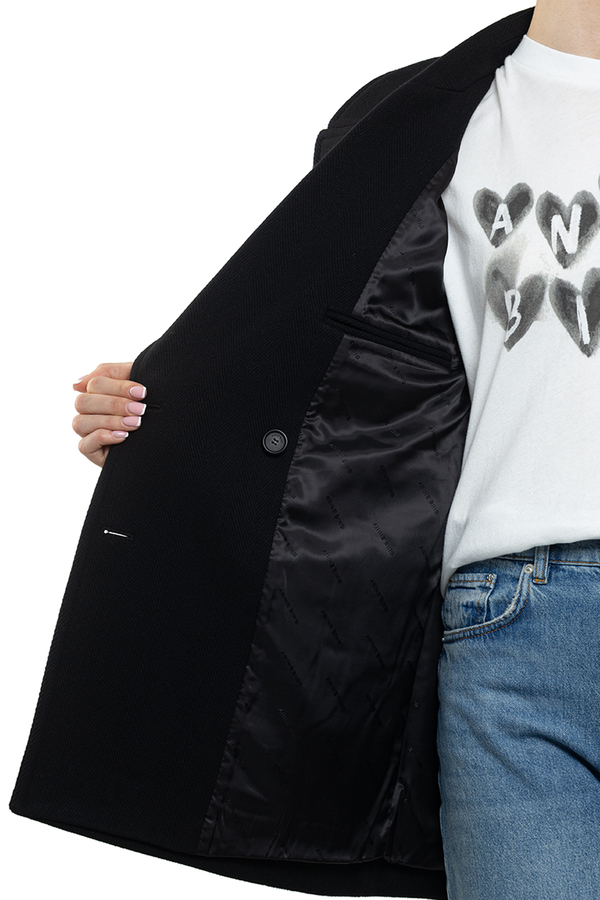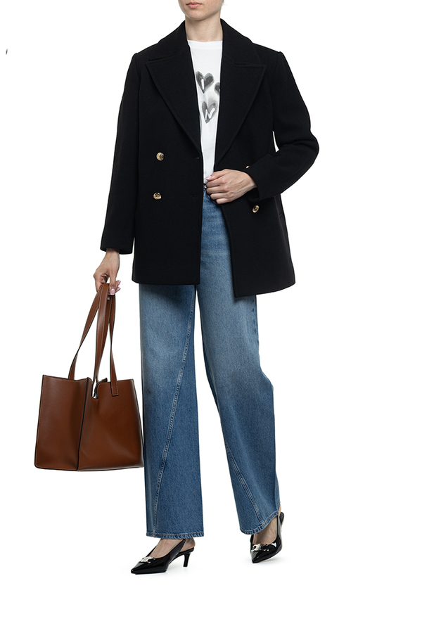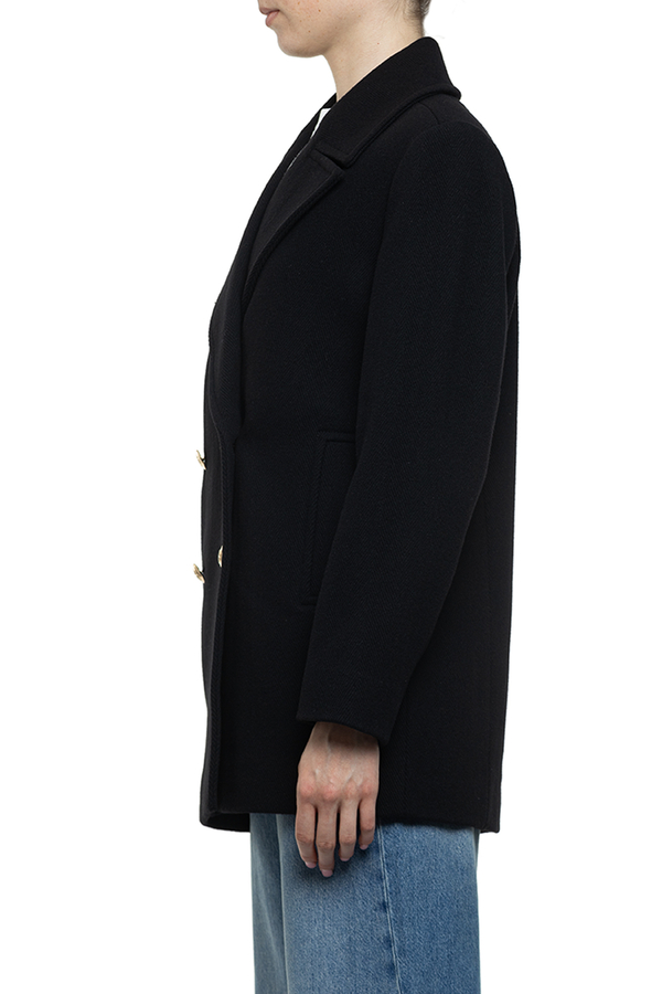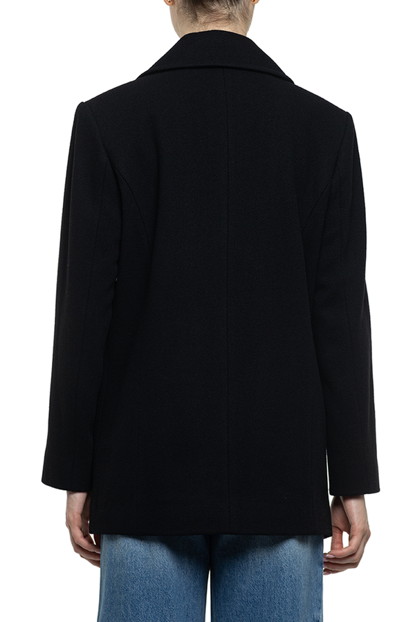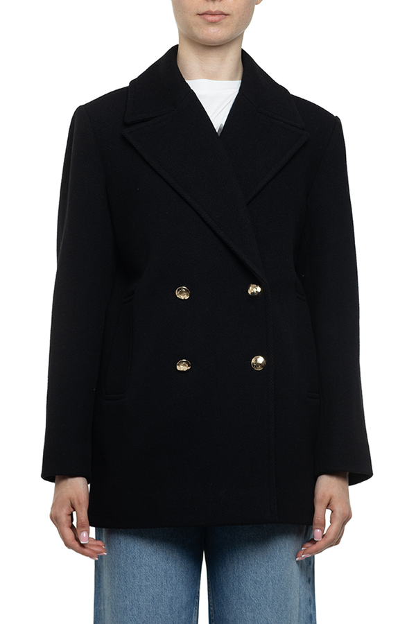 - Двобортне пальто, комір з лацканами, застібка на золотисті гудзики спереду, зкошені прорізні кишені