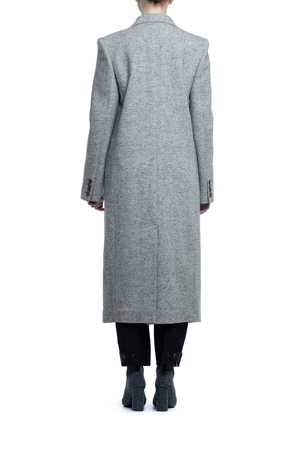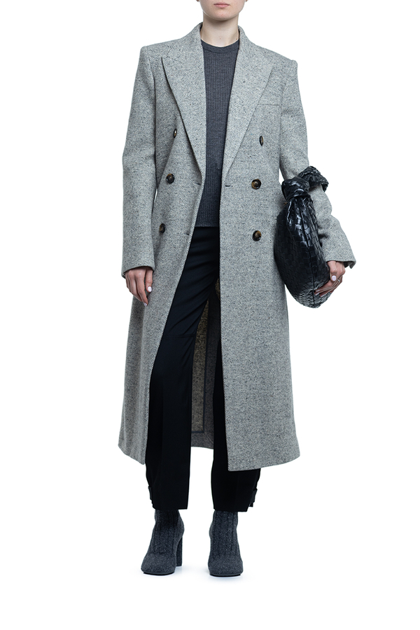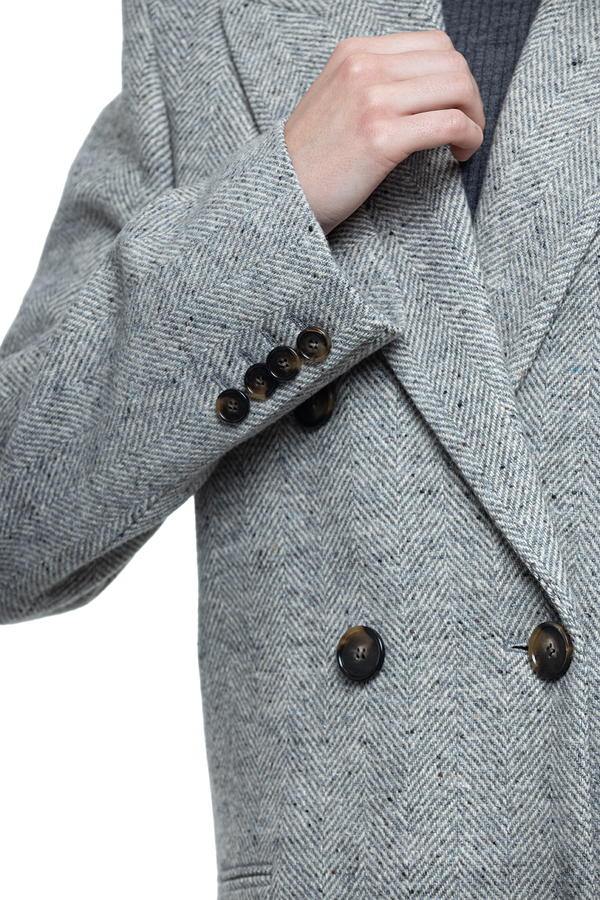 - Двобортне пальто з гострими лацканами, візерунок «ялинка», внутрішні підплічники, манжети та застібка на гудзики, три прорізні кишені спереду
