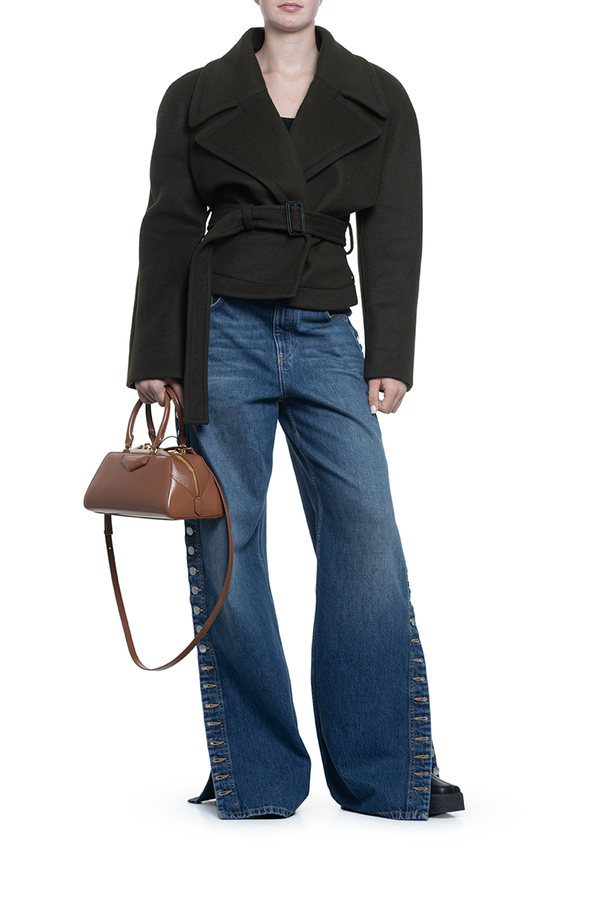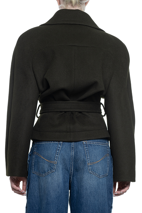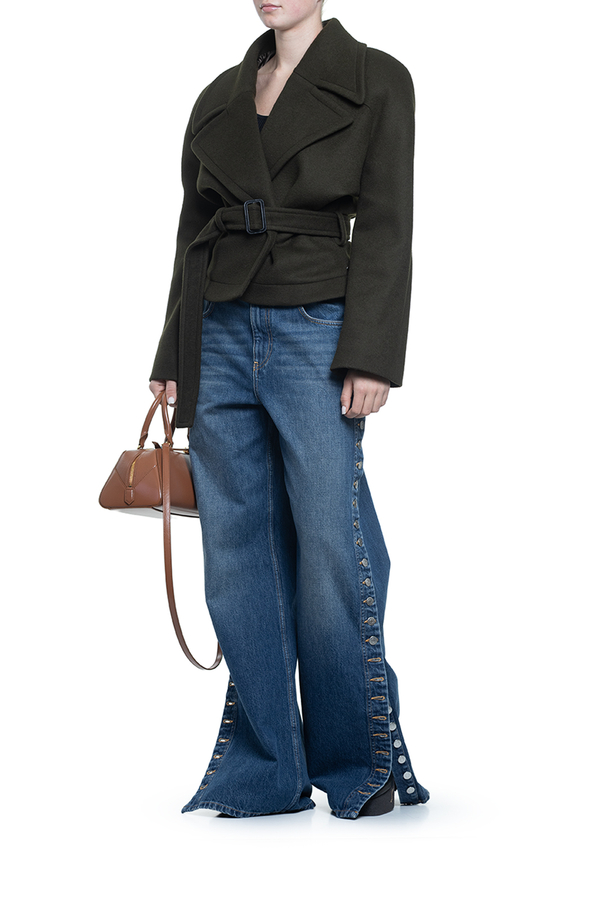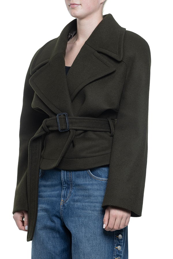 - Коротке пальто із вовни, комір з лацканами, прихована застібка на ґудзики спереду, знімний ремінь