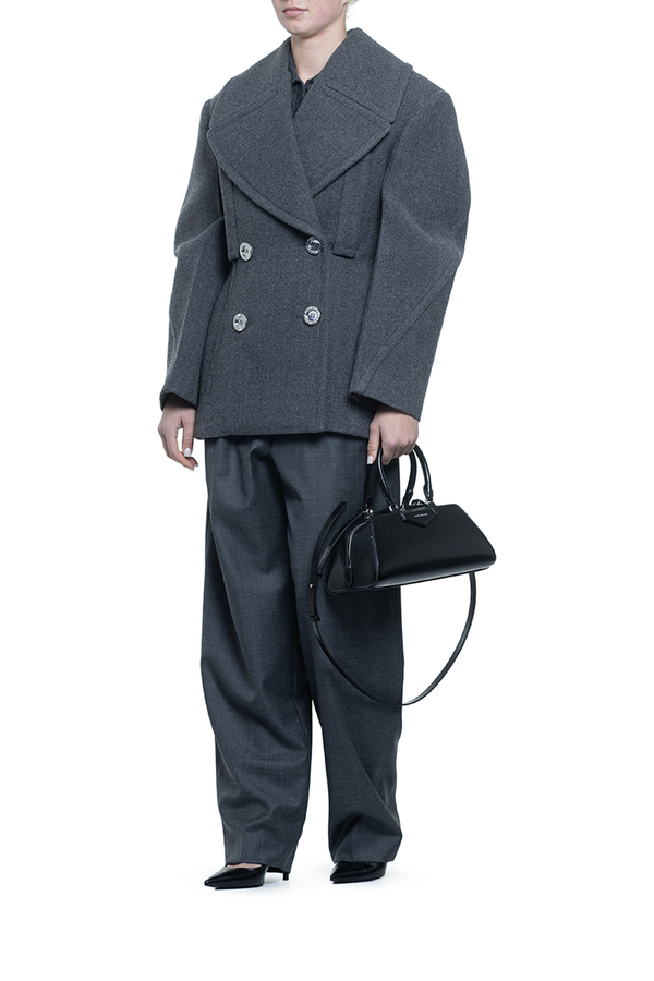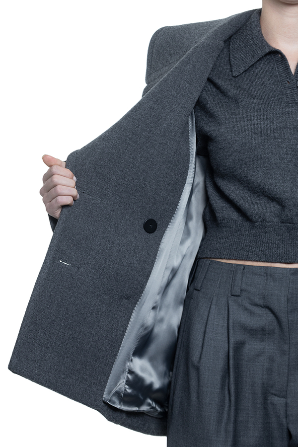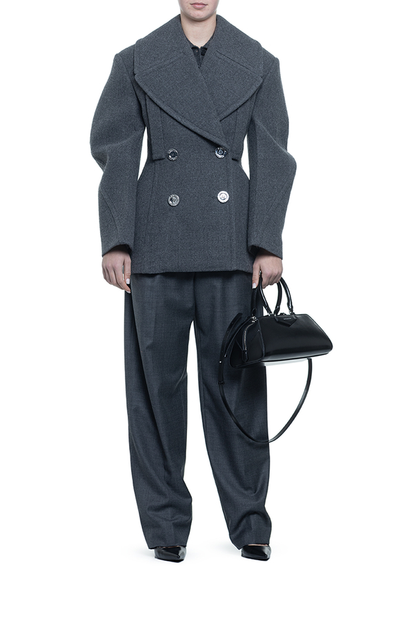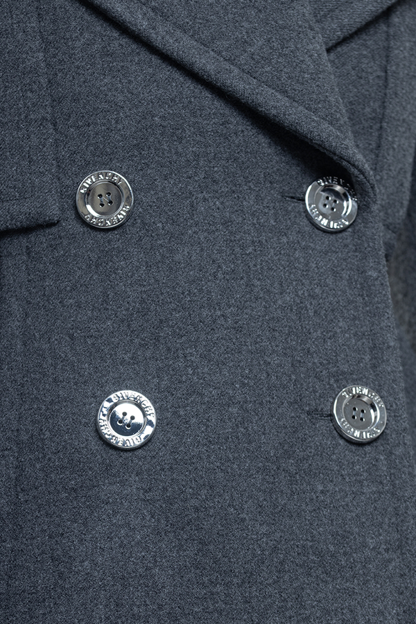 - Двобортне коротке пальто, відкладний комір з лацканами, приталений силует, спереду застібка на гудзики