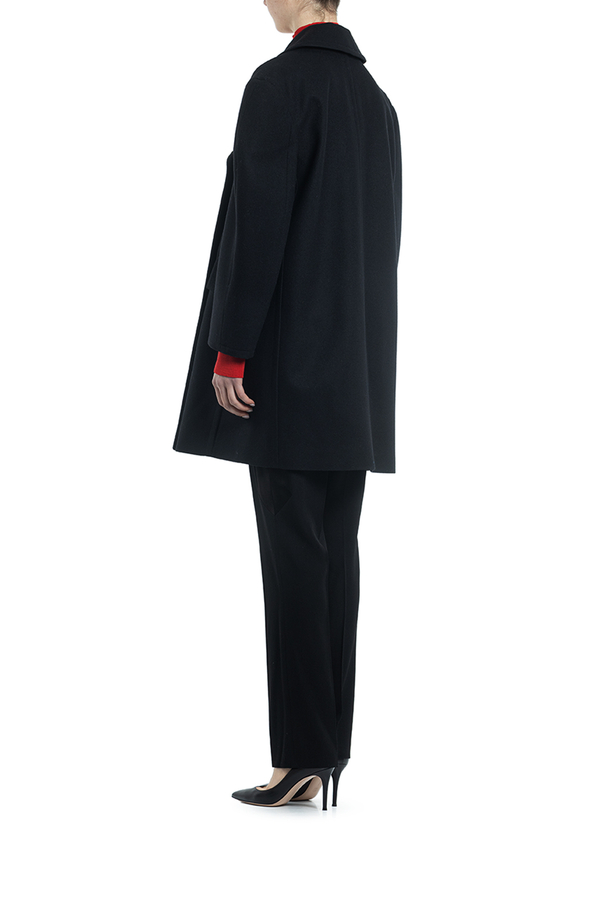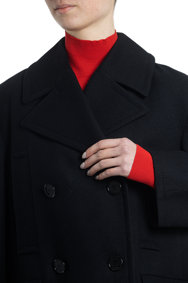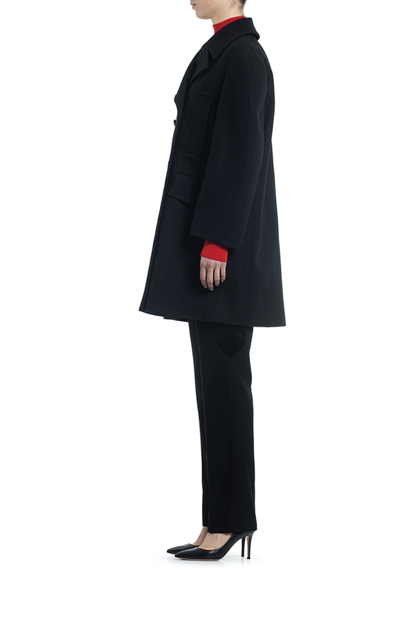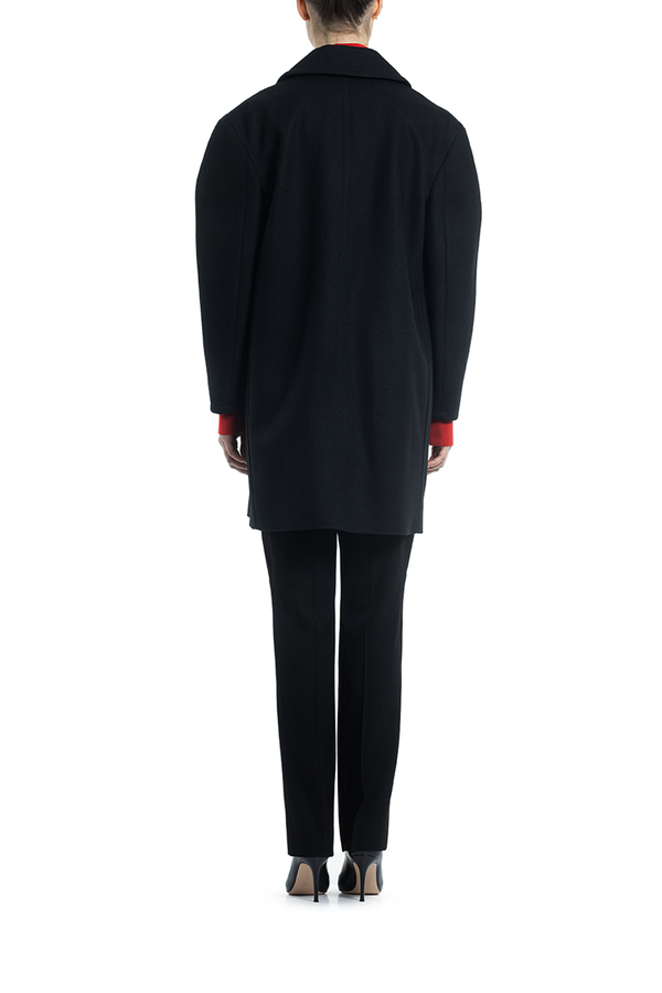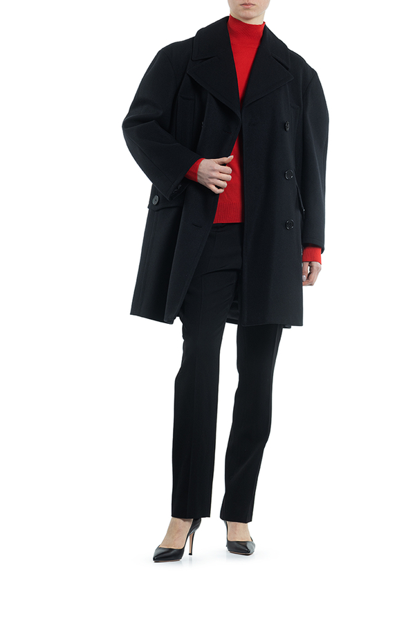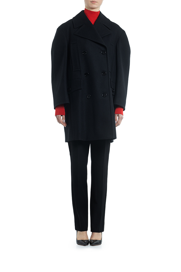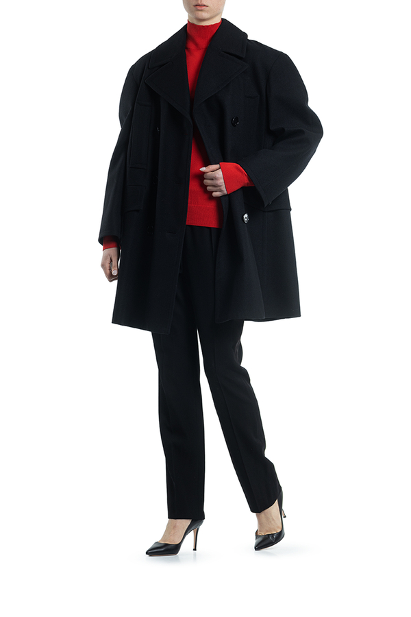 - Двубортне пальто з вовни з великими лацканами і структурованими довгими рукавами. Застібка на гудзики, дві передні кишені з клапанами, дві прорізні кишені на грудях.