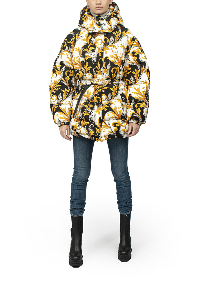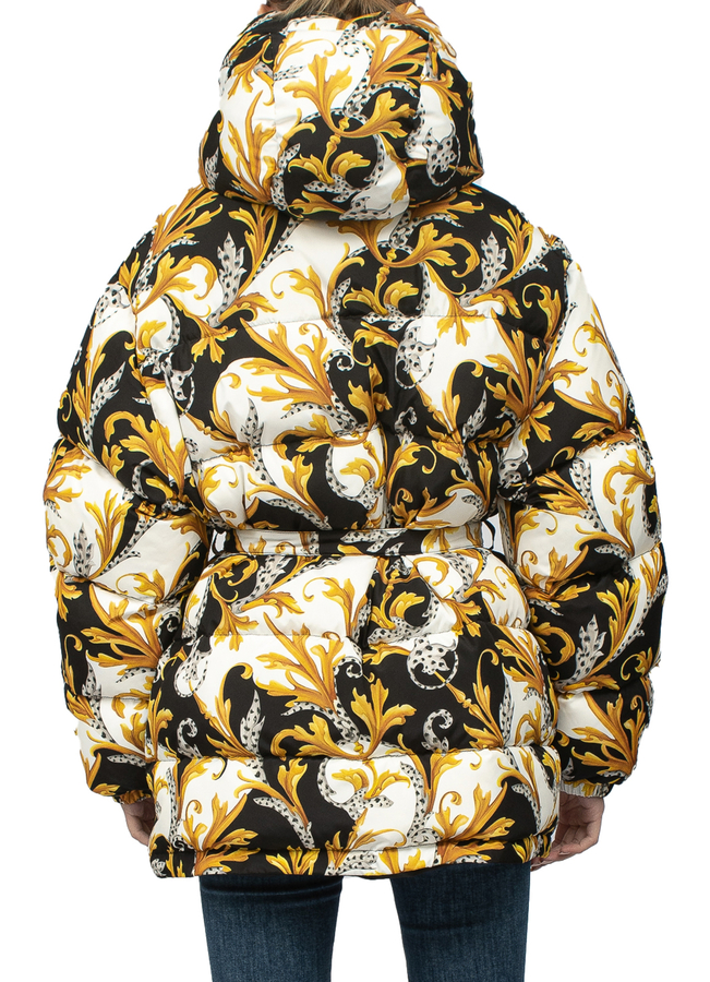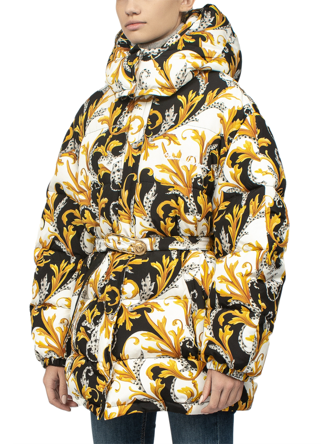 - Пуховик зі знімним капюшоном з візерунком Barocco Acanthus. Застібка на блискавку з планкою на кнопках, ремень на талії з пряжкою золотистого коліру.