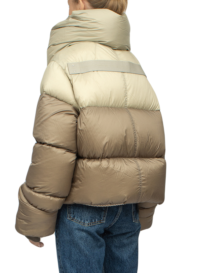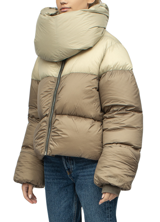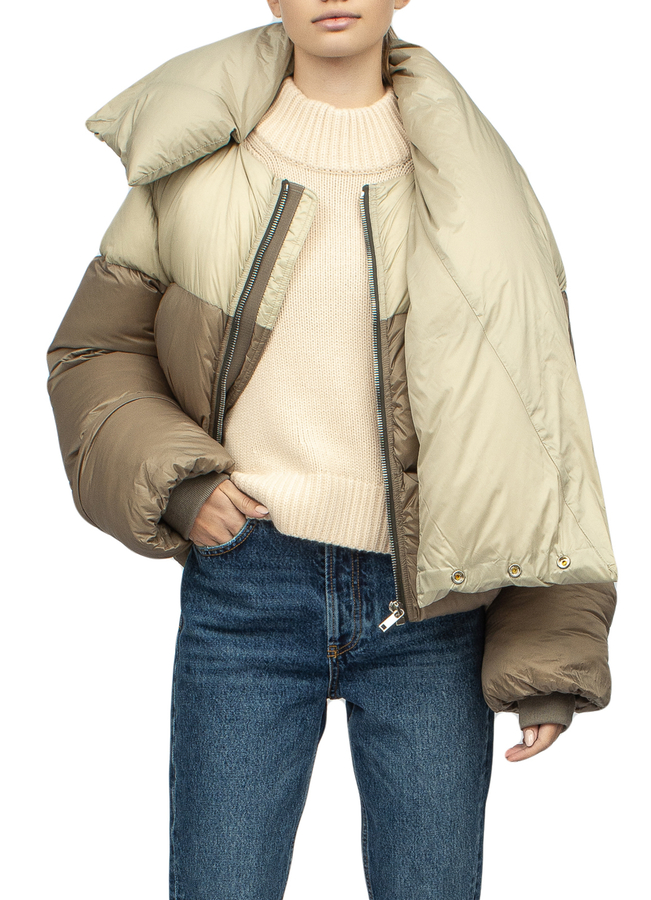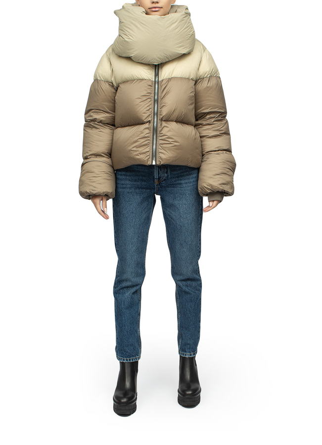 - Пуховик укороченої довжини с завеликими рукавами і декоративним коміром-шарфом. Застібка на блискавку спереду.