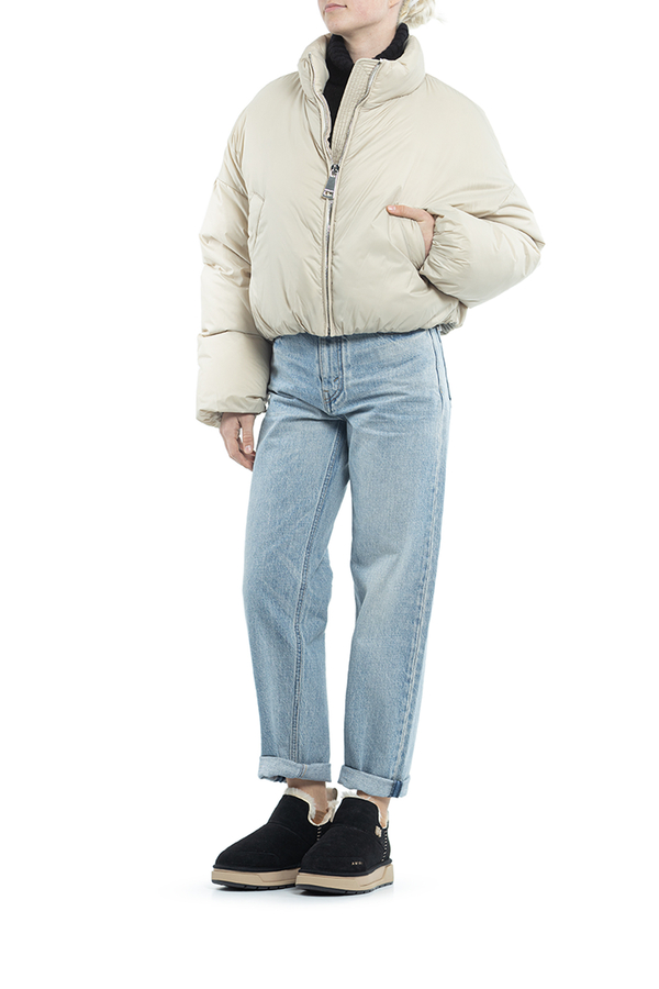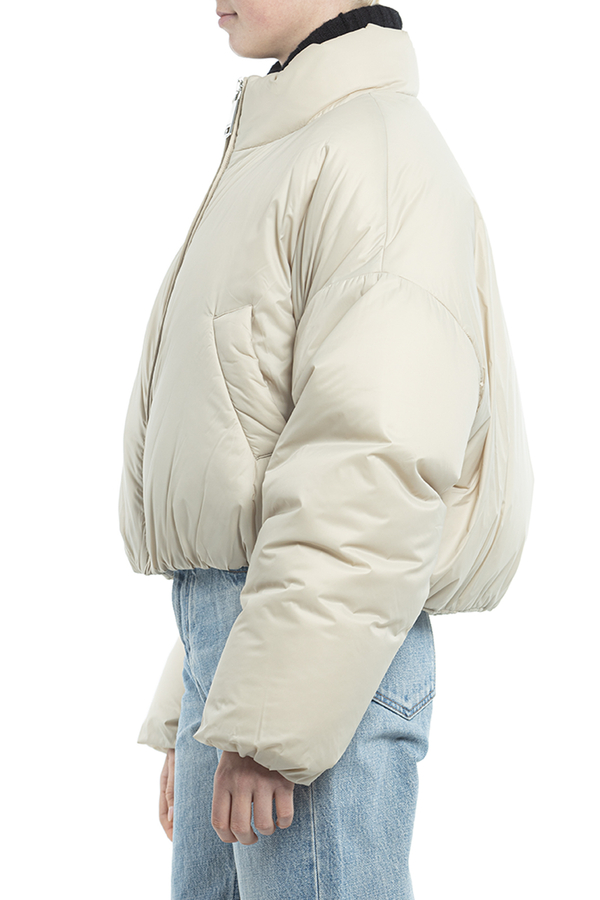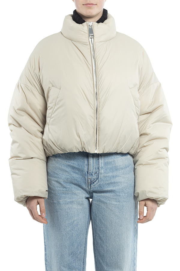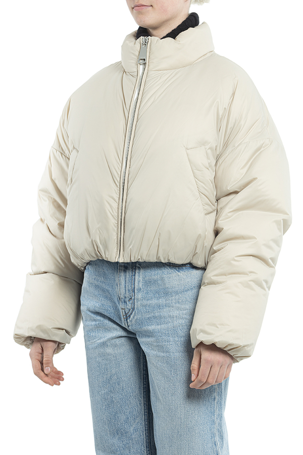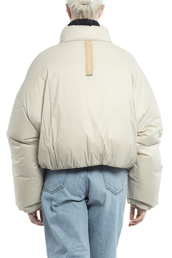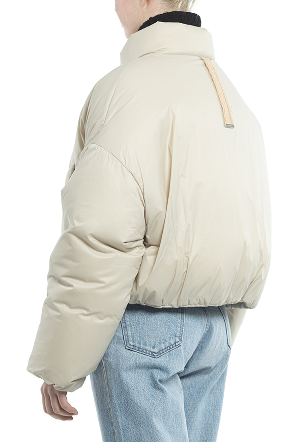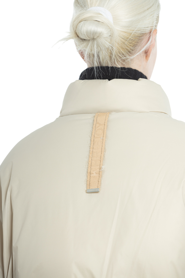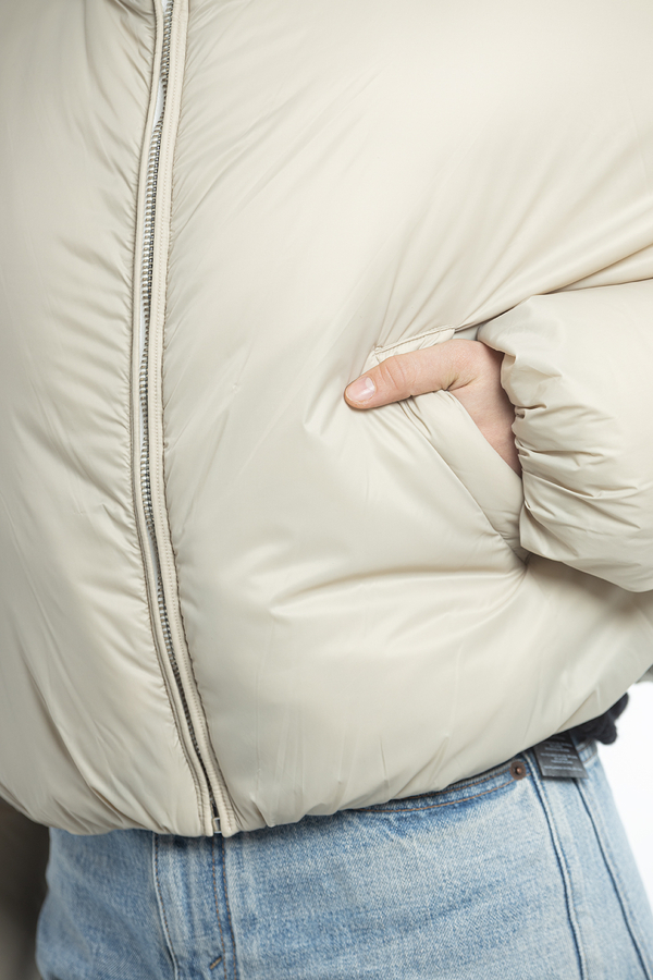 - Пуховик із коміром-стійкою, застібка-блискавка спереду, логотип позаду, внутрішній регульований шнурок знизу, косі прорізні кишені спереду