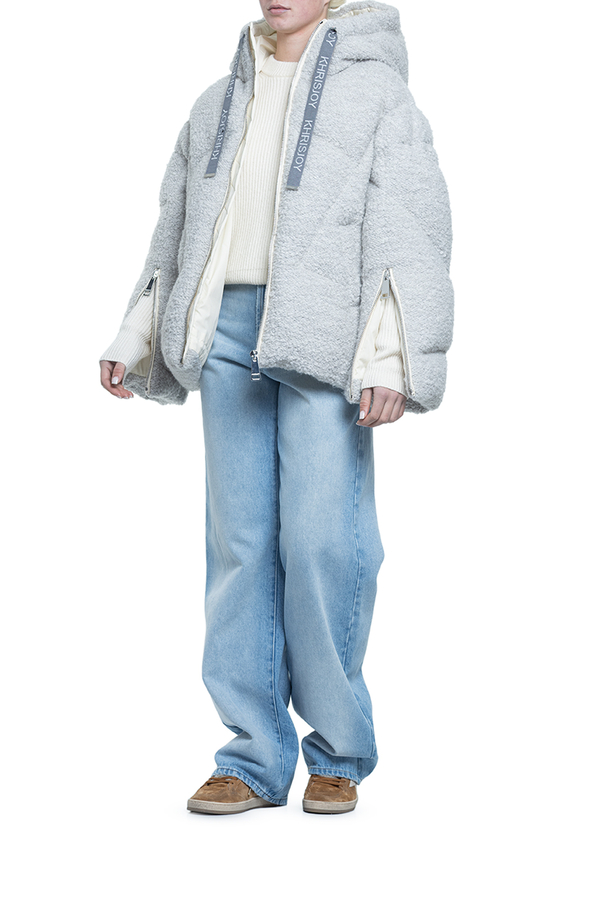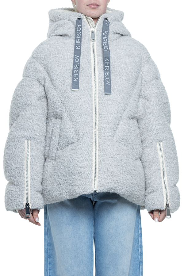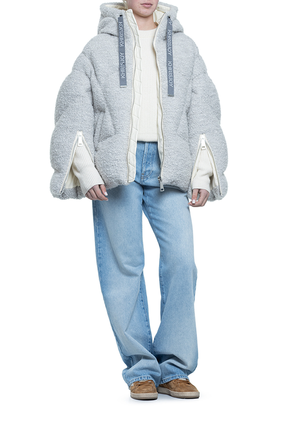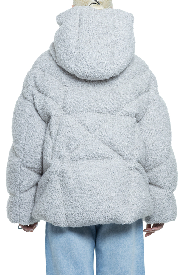 - Пуховик з регульованим капюшоном, товстий комір-стійка, V-подібні шви спереду та ззаду, геометричний мотив «X» на спині, спереду та на рукавах блискавки, дві прорізні кишені з боків