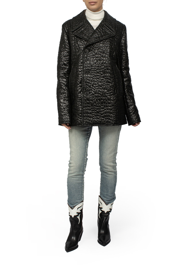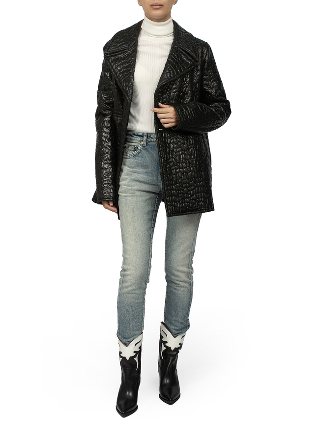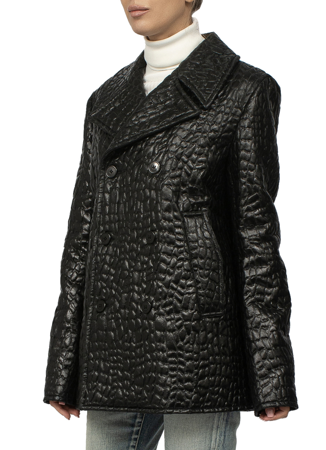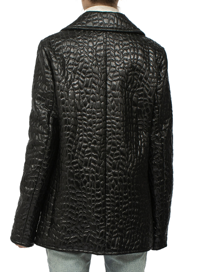 - Фактурний піджак з глянцевої тканини. Довгі рукави, бічні прорізні кишені, двубортна застібка на гудзики. Вирізний комір з гострими лацканами.