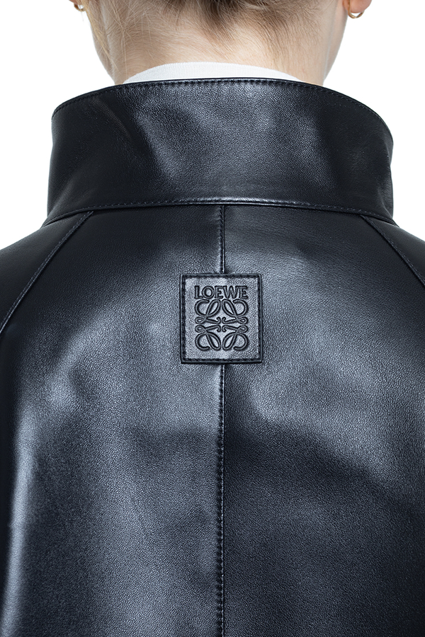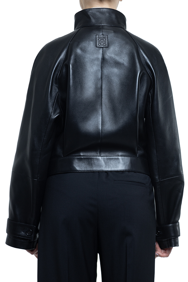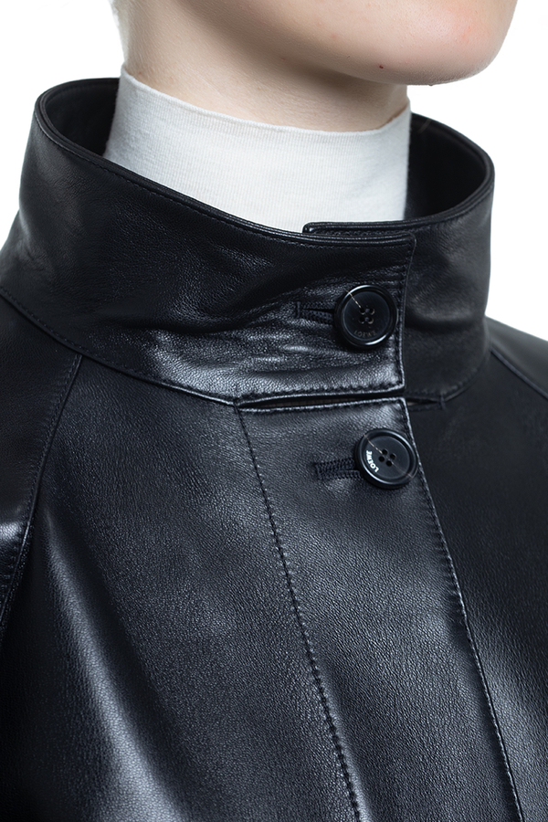- Шкіряна куртка з високим коміром, рукави реглан, манжети на хлястиках, повна підкладка, дві прорізні кишені по боках та одна внутрішня, регульований пояс із пряжкою, потайна застібка на гудзики спереду, нашивка з тисненим логотипом на спині