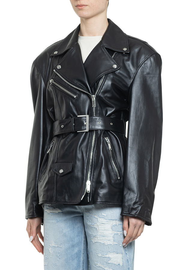 - Шкіряна куртка, ремінь на поясі з тисненим логотипом, відкладний комір з гострими лацканами, асиметрична застібка на блискавку, одна нагрудна та дві передні прорізні кишені на блискавці