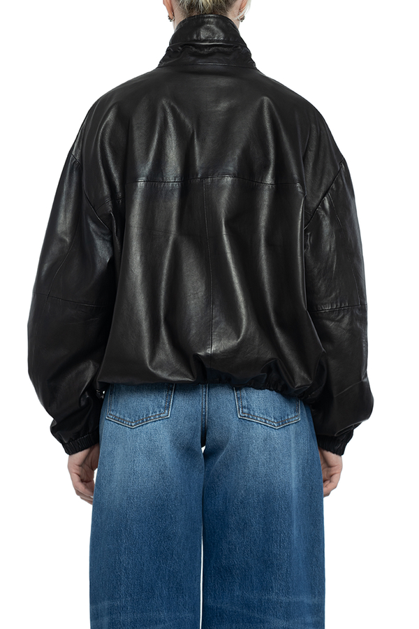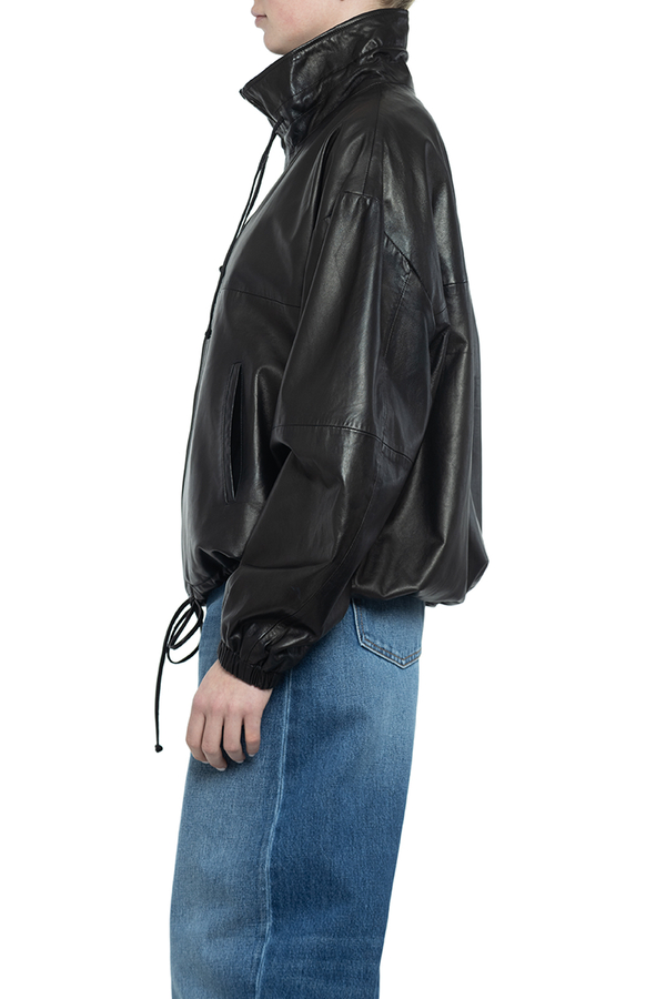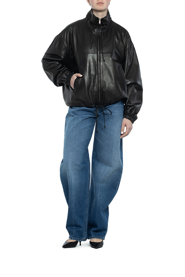 - Шкіряна куртка з довгими рукавами, регульований комір-стійка на шнурку, еластичні манжети, занижена лінія плечей, застібка на блискавку спереду, дві прорізні кишені по боках, регульований низ на шнурку