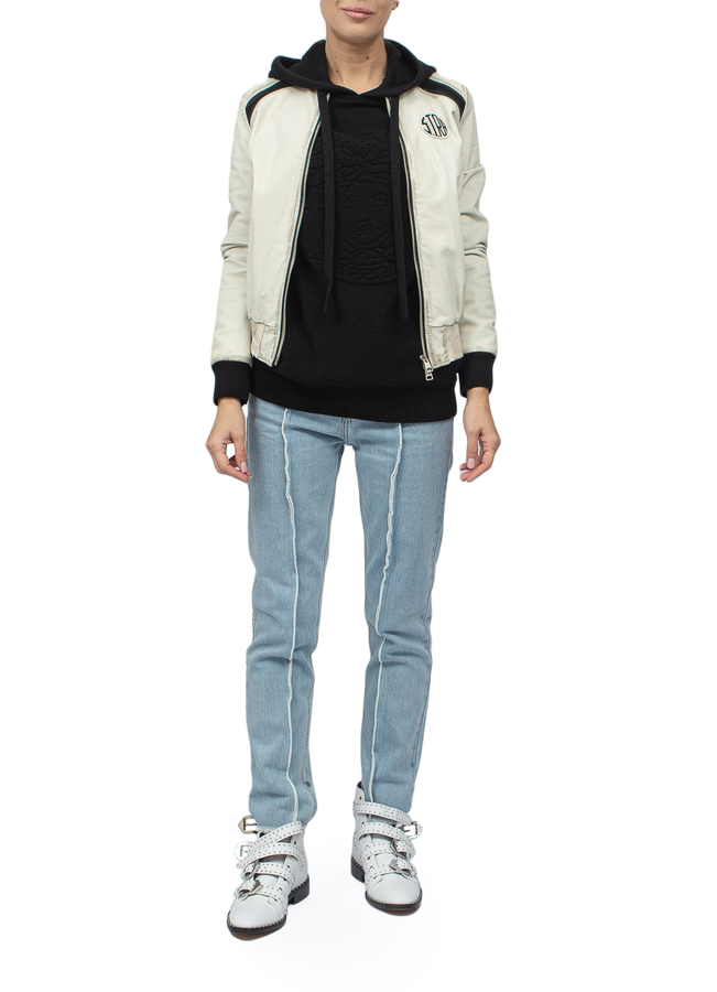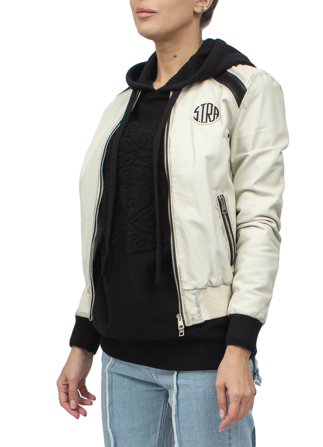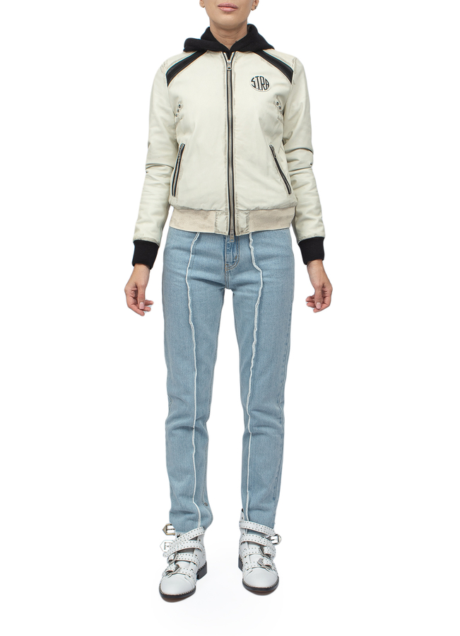 - Шкіряна куртка-бомбер з довгими рукавами і застібкою на блискавку спереду.