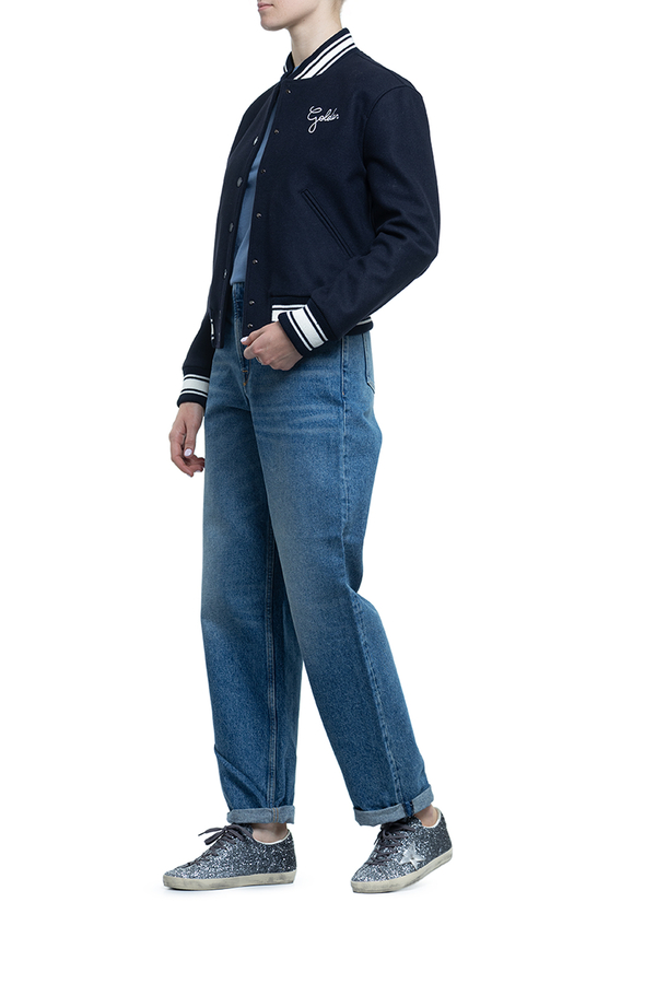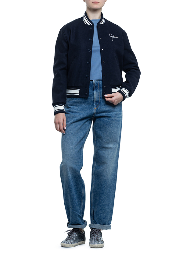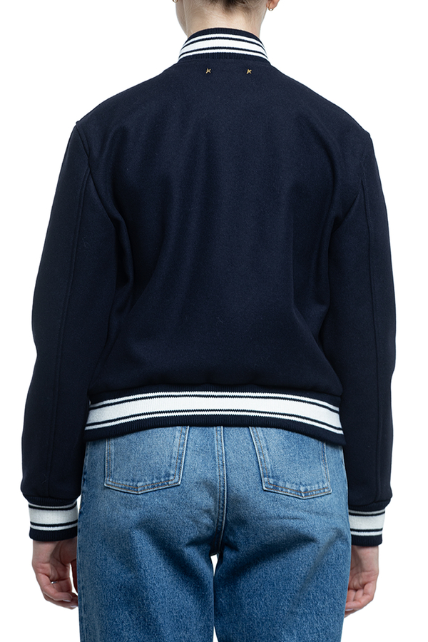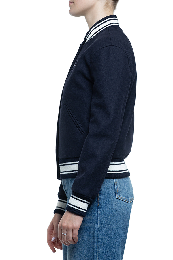 - Бомбер з довгими рукавами, круглий виріз горловини, застібка на кнопки спереду, смугова деталізація, дві прорізні кишені спереду, контрастний білий логотип на грудях, подвійна золота зірка на спині
