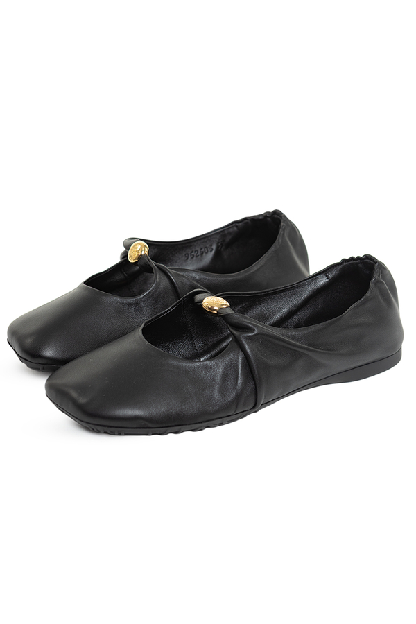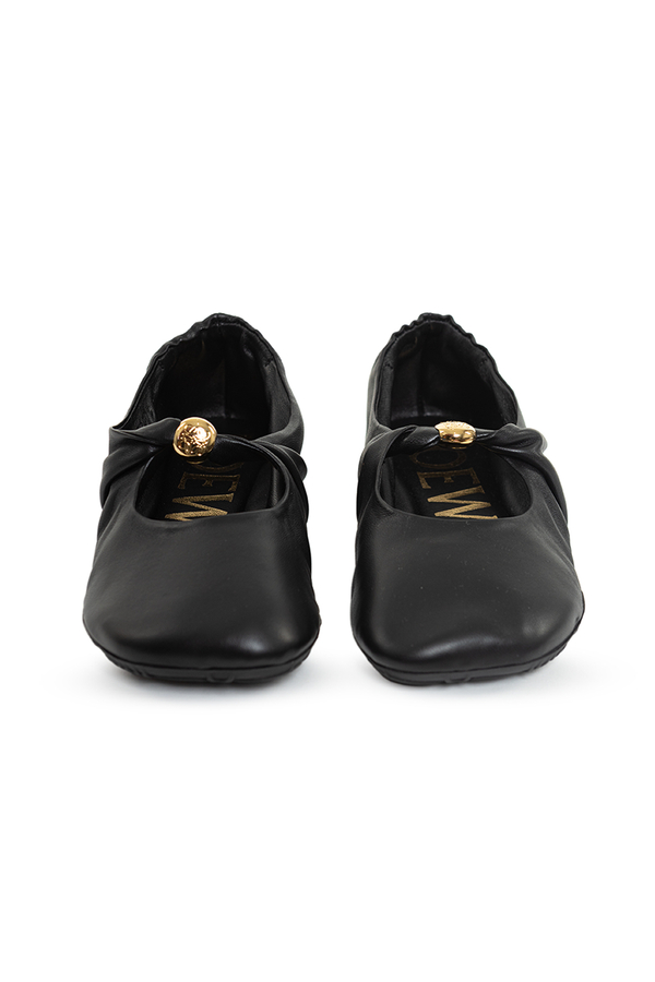 - Шкіряні балетки з гнучким верхом, металеве оздоблення з гравіюванням анаграми, фірмовий носок, шкіряна устілка, гумова підошва з тисненням анаграми