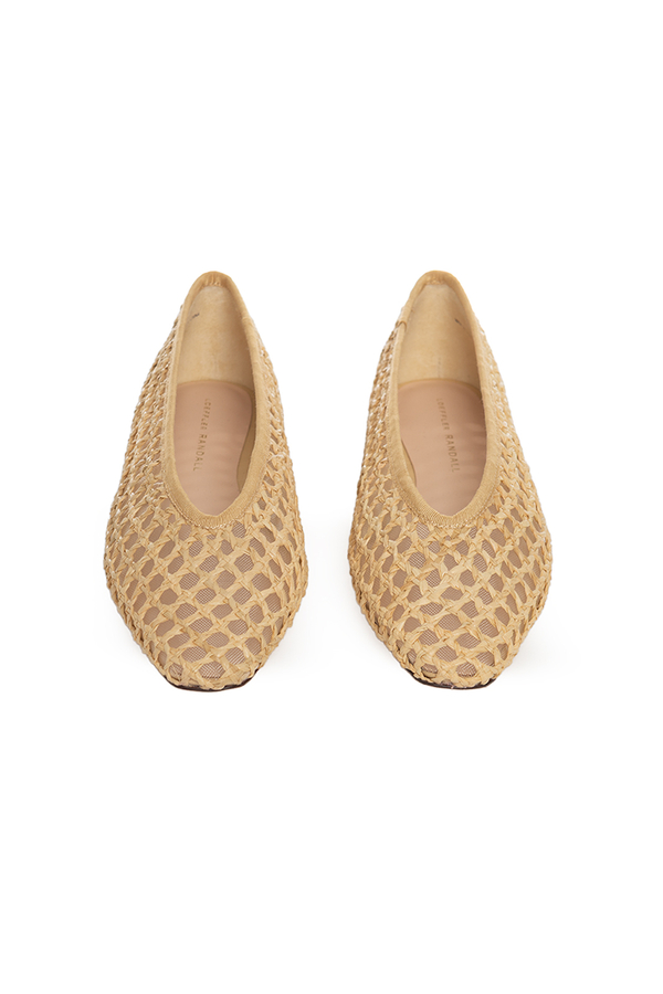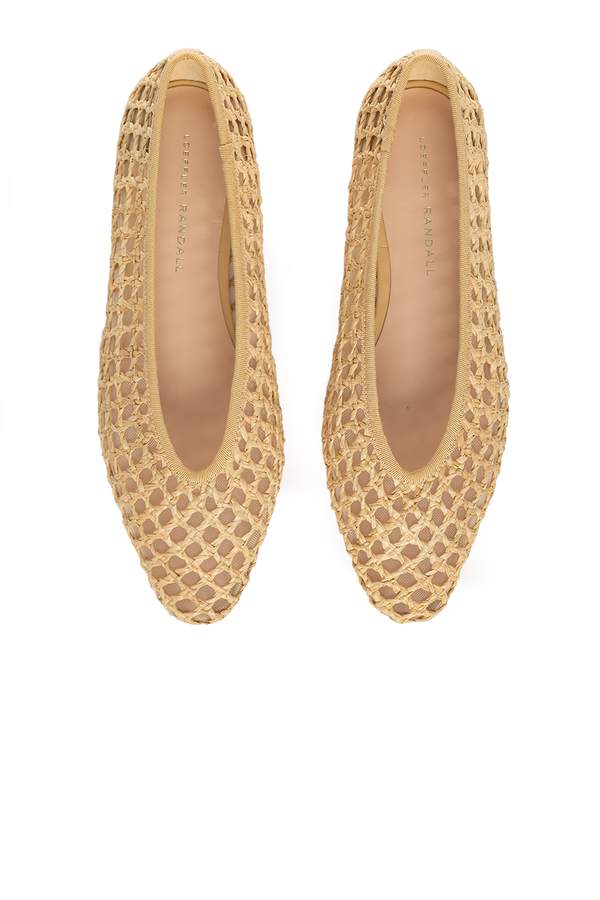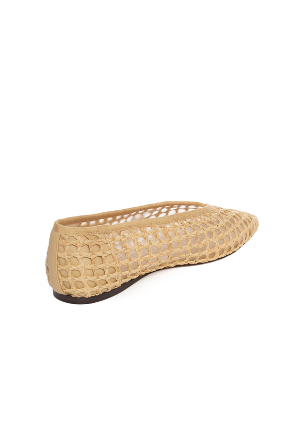 - Балетки із рафії з квадратним носком, плетений дизайн, м'яка устілка із золотим тисненим логотипом