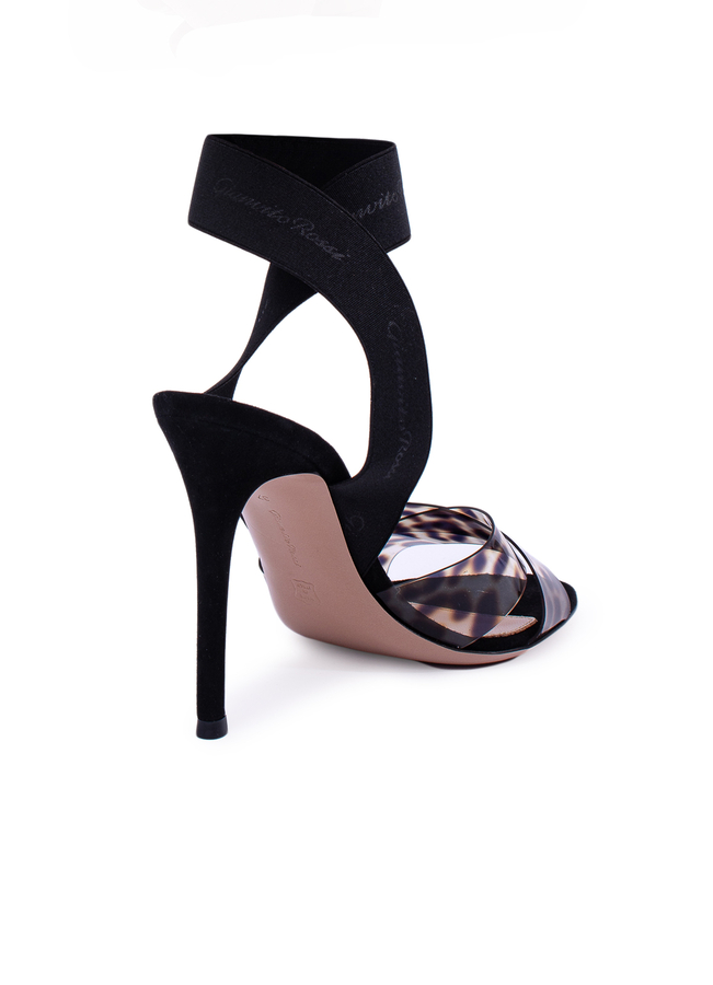 - Чорні босоніжки Criss Cross з відкритим носком, фірмовою устілкою та високим каблуком на шпильці. Петля навколо щиколотки з еластичного трикотажу та силиконова союзка з принтом леопарду.