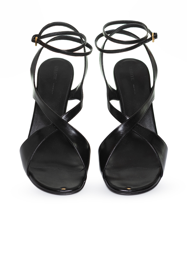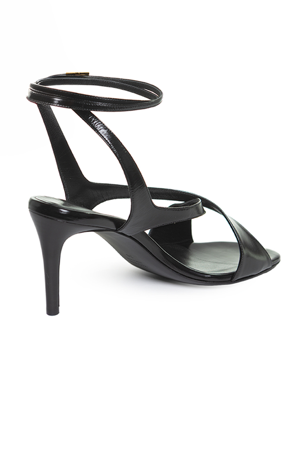 - Шкіряні босоніжки з ремінцями, відкритий носок, каблук-шпилька, фірмова шкіряна устілка, застібка на пряжці