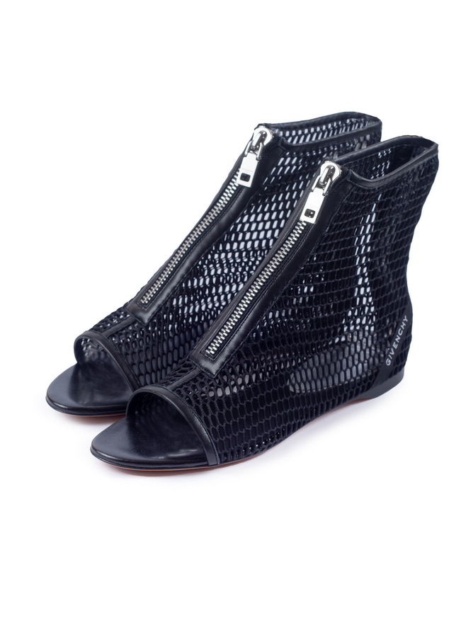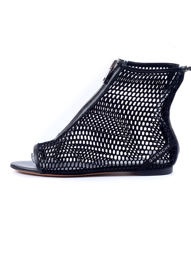 - Босоніжки сітчаті зі шкіри. На пласкій подошві, з застібкою на блискавку попереду. Відкритий носок, прикраса - стрічка з написом бренду на п'яті.