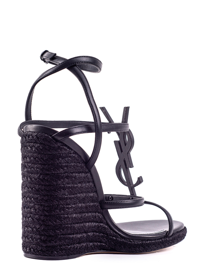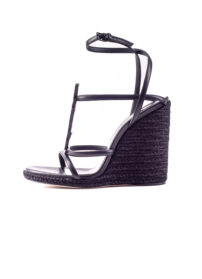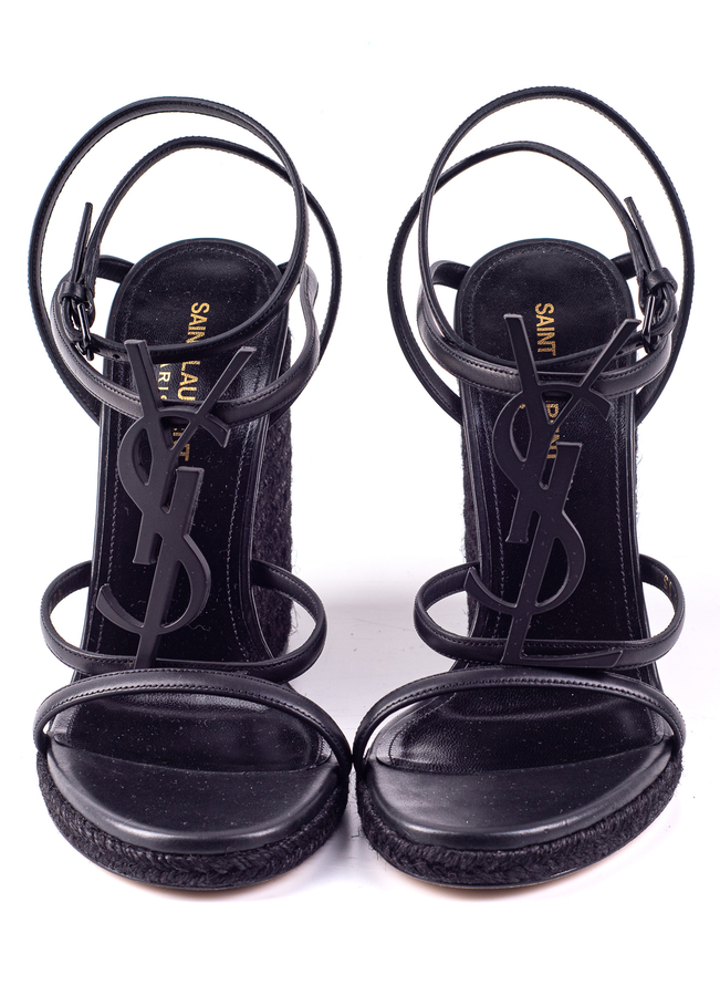 - З відкритим носком, фірмовою устілкою, ремінцем на щиколотку з боковим застібанням на пряжку, високим каблуком на танкетці, дизайном на бретельках і тональним логотипом YSL спереду.