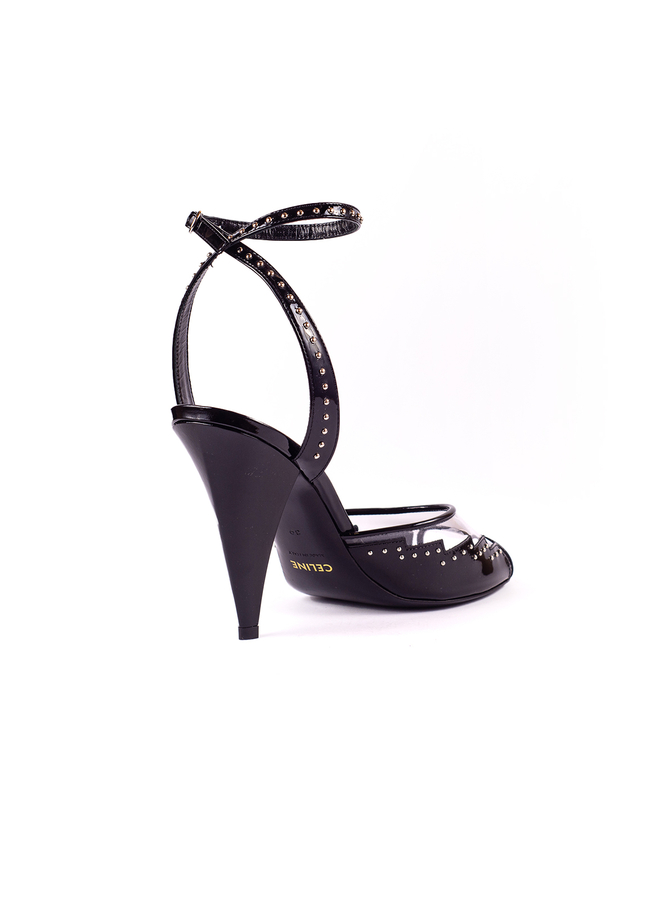 - Лакові босоніжки с заклепками. Відкритий круглий носок, тонкий ремінець навколо щиколотки с заклепками, високий каблук-шпилька.