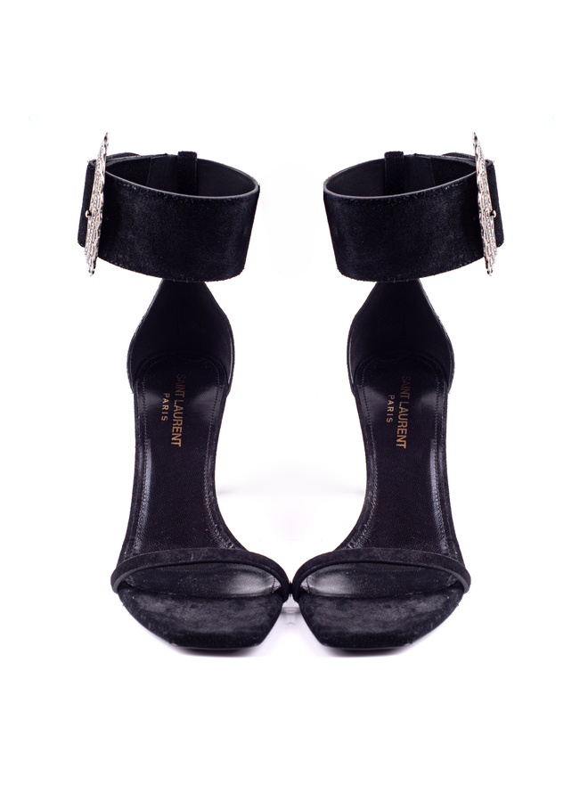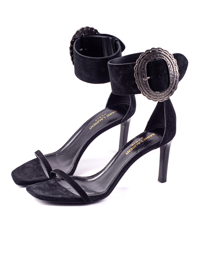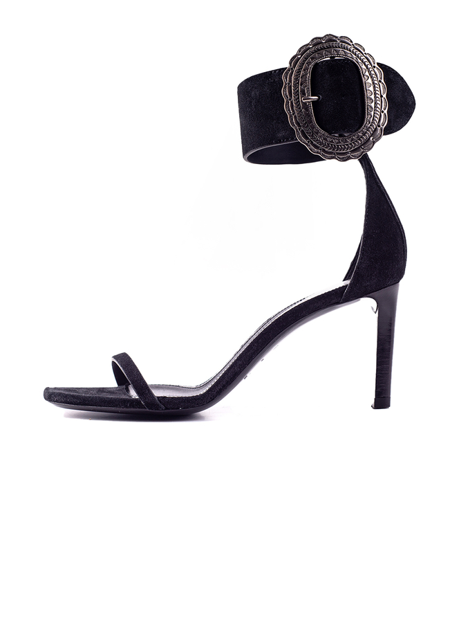 - Чорні босоніжки з м'якої міцної замші, зі скошеним мисом і шпилькою середньої висоти. Фіксується на нозі за допомогою широкого ремінця і великої сріблястою пряжки.