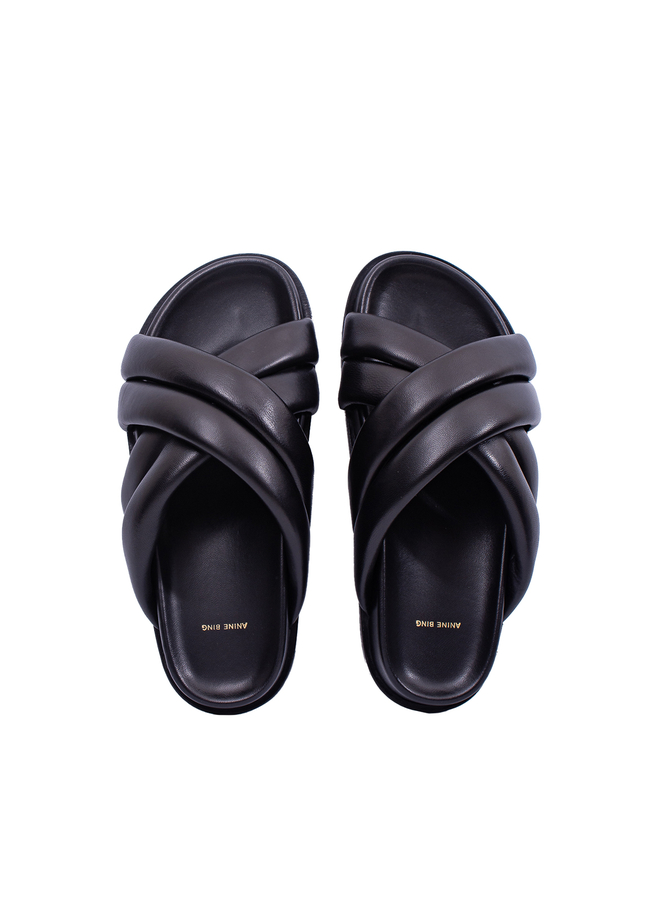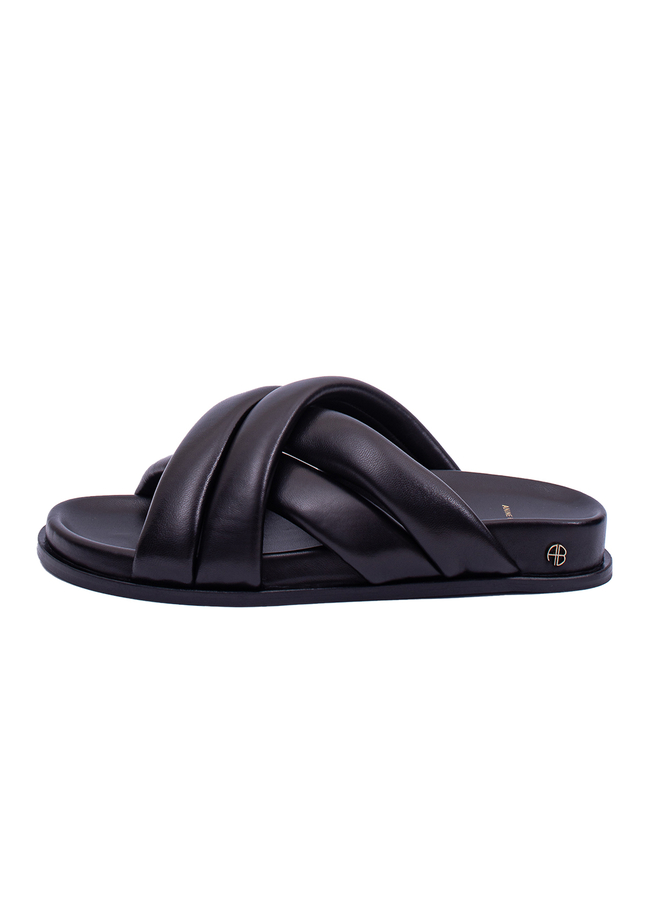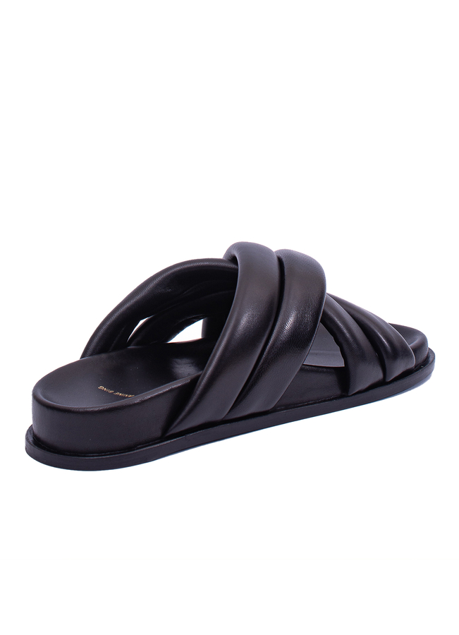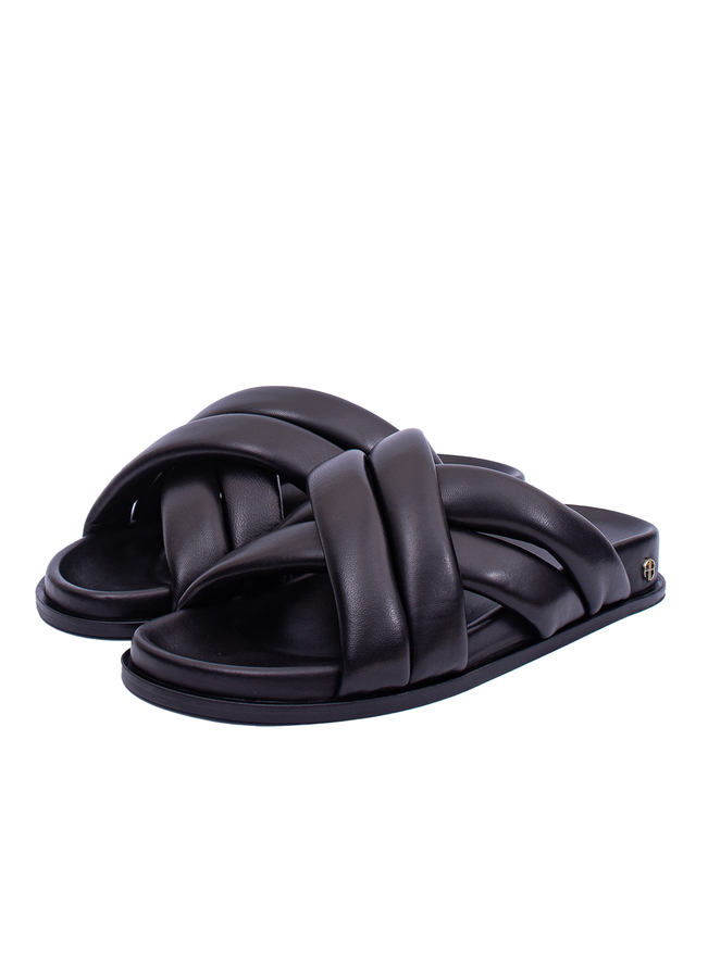 - Шкіряні шльопанці оздоблені широкими перехрещеними ремінцями. Круглий відкритий носок, фірмова устілка, плоска шкіряна підошва.