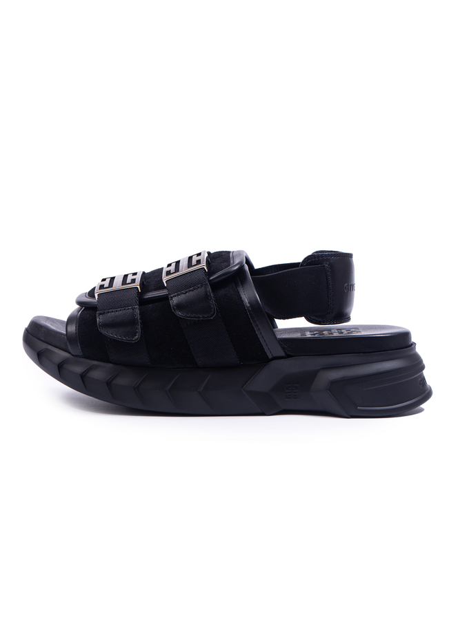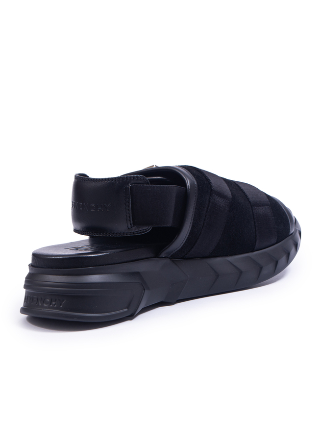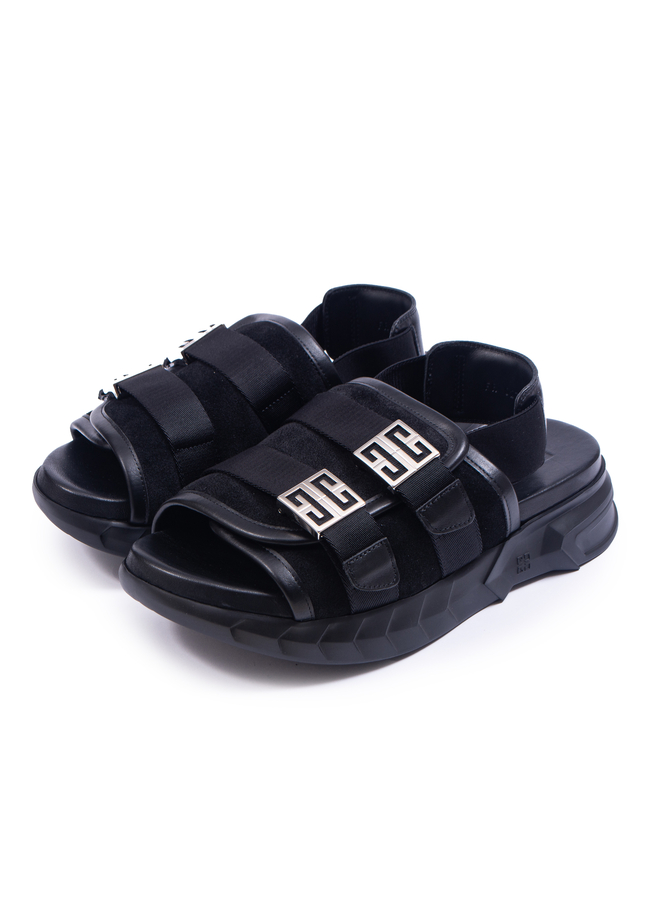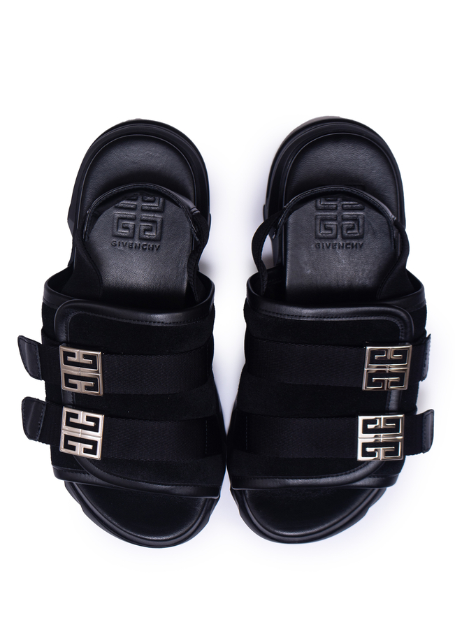 - Босоніжки зі шкіри. Верх із замші оброблений гладкою шкірою і має два ремінці з тканини з металевими пряжками з монограмою. Ремінець на задній частині щиколотки з тканини зі шкіряним каблуком з логотипом. Знімна устілка зі шкіри з логотипом.