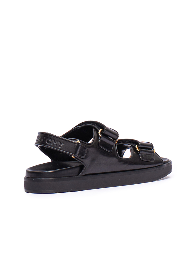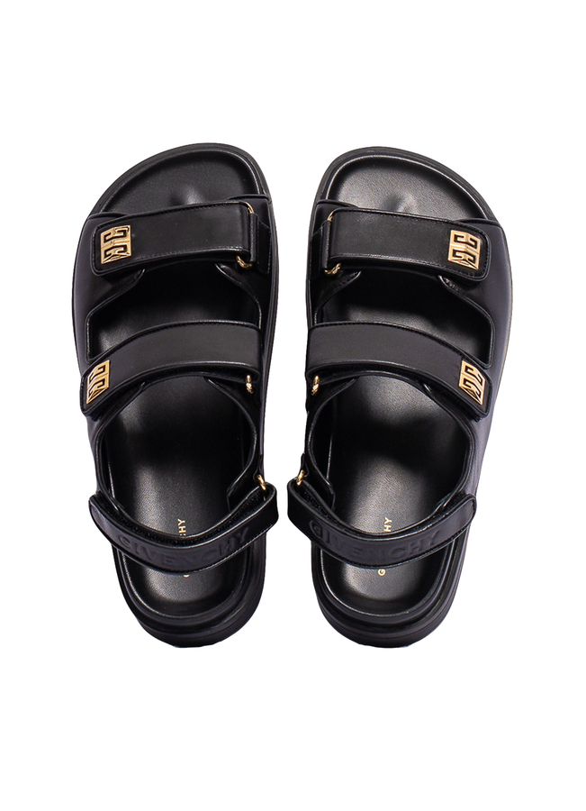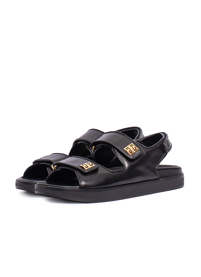 - Шкіряні сандалії з ремінцями на липучках, золотисті металеві деталі на ремінцях, тиснений логотип ззаду, заокруглений носок