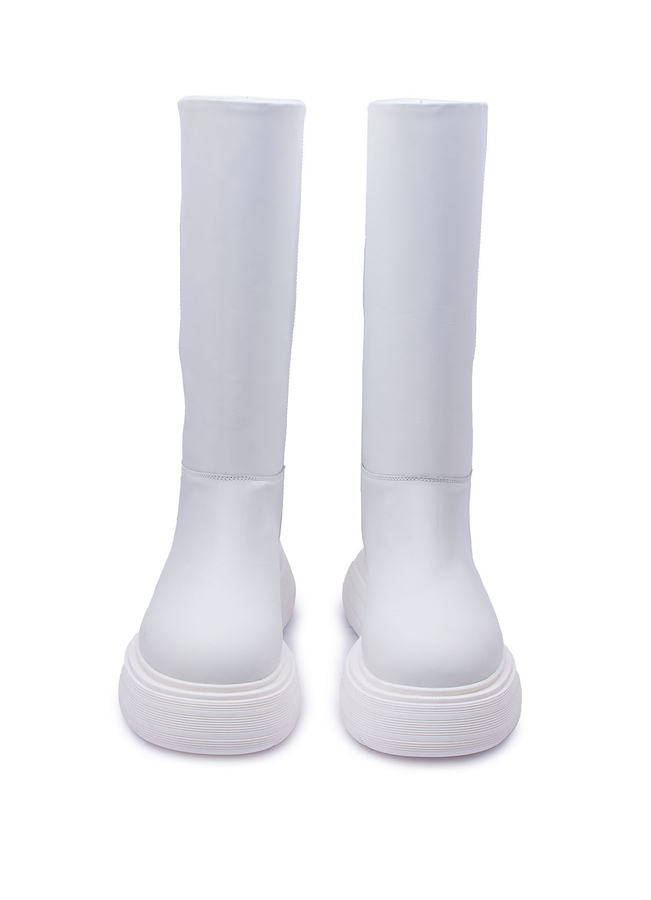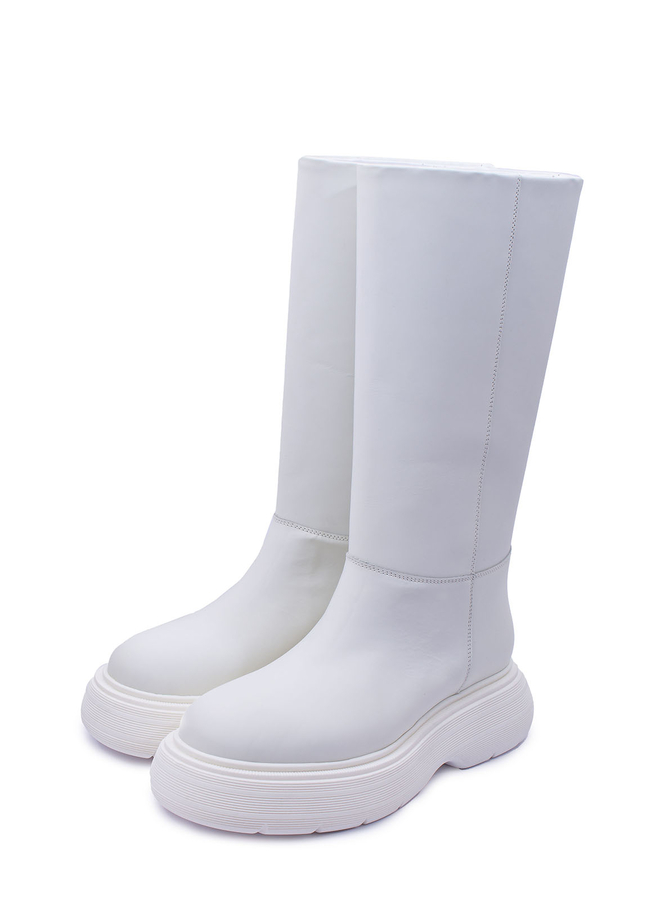- Шкіряні чоботи Tubular, з ребристою високою гумовою підошвою. Широке голенище, без застібки, з круглим носком, висотою до коліна.