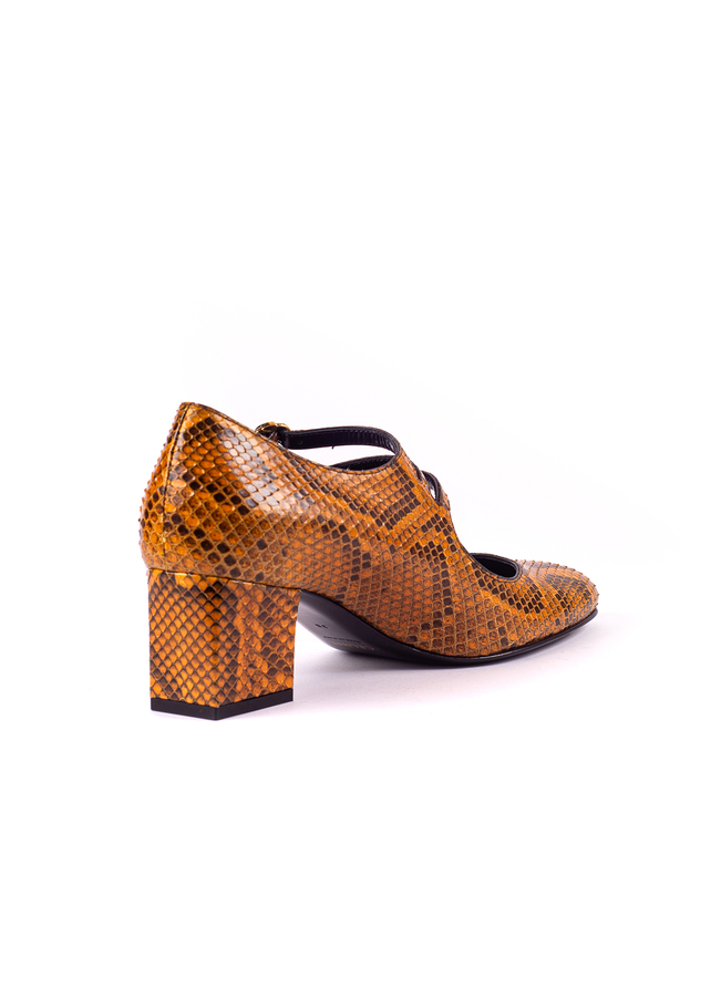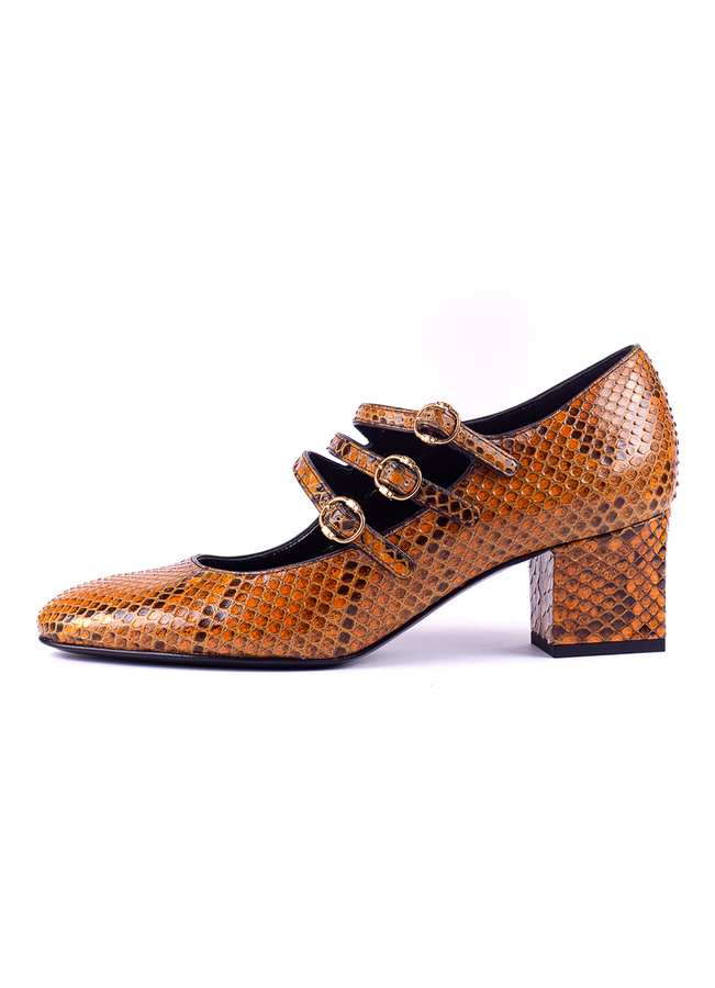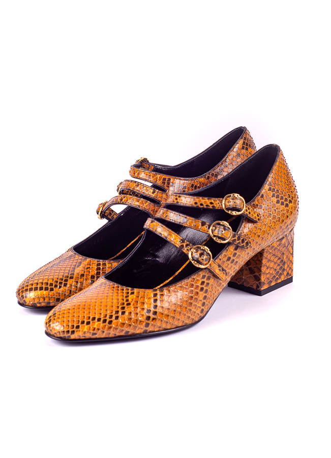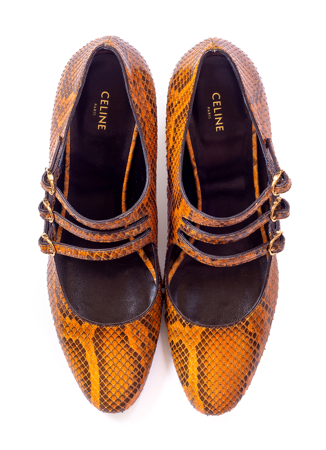 - Лакові туфлі з пітону з трьома пряжками. Верх -100% шкіра пітона, підкладка зі шкіри, обтягнутий підбор з кутастими краями 55 мм, подовжений мигдалеподібний мисок, фігурні ремінці з подвійними пряжками з гравіюванням «тріумф», шкіряна устілка, тонка шкіряна підошва.