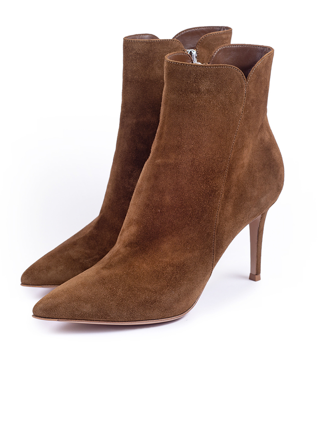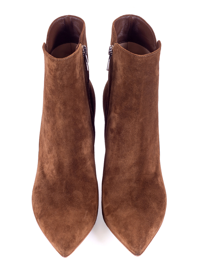 - Коричневі ботильйони Levy 85 із замші з загостреним носком, верх із замші, бічна застібка на блискавку, шкіряна устілка з логотипом, каблук на шпильці та шкіряна підошва.