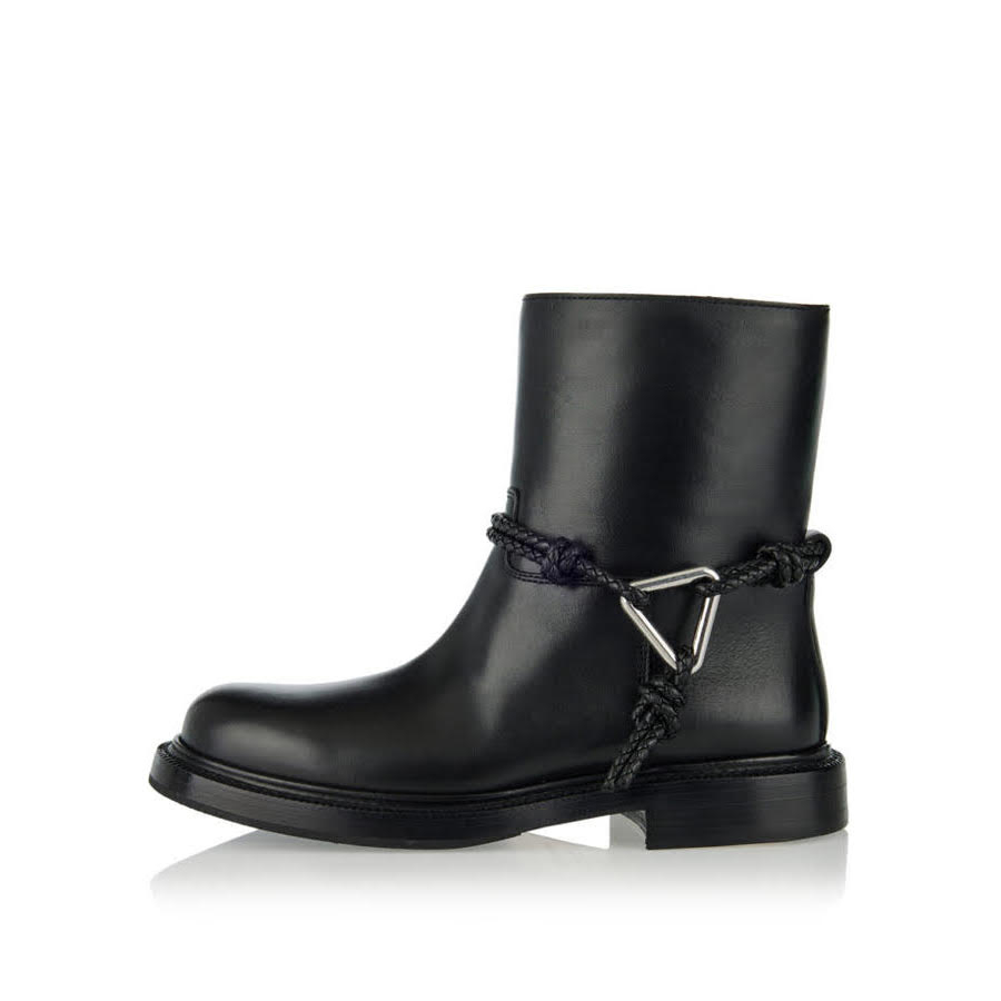 - Шкіряні черевики з круглим носком, квадратні підбори, фірмова устілка, на щиколотці плетені ремінці з фірмовим металевим трикутним елементом