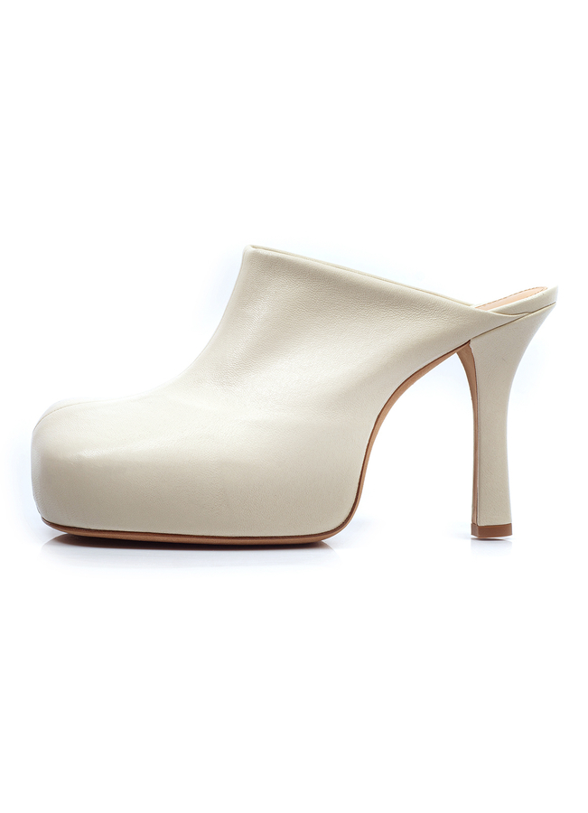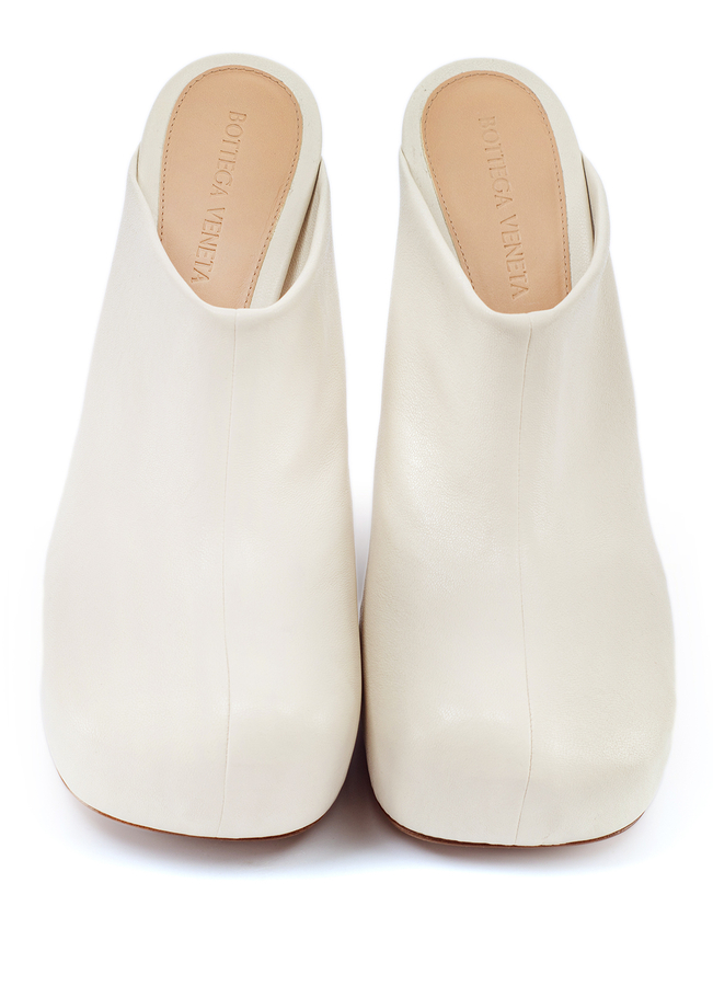 - Мюлі з кремової шкіри, круглий носок, підошва на платформі, в стилі Slip-on, фірмова устілка, каблук на шпильці. З відкритою п’ятою.