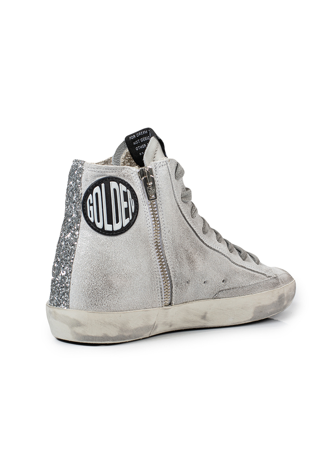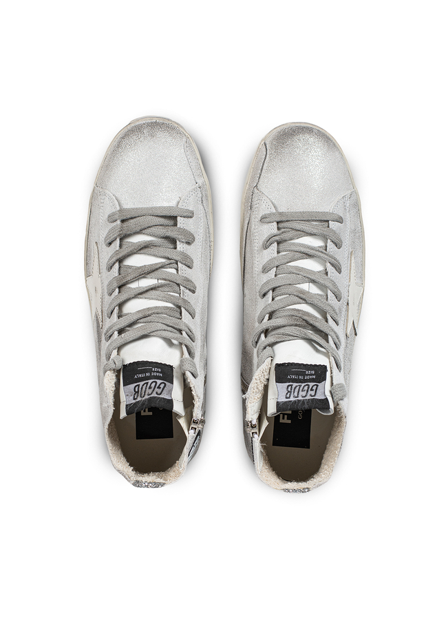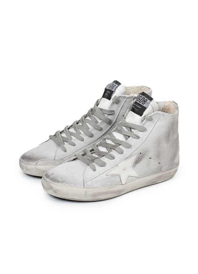- Високі кросівки на шнурівці, збоку застібка-блискавка, ефект потертості, на язичку нашивка логотипу, збоку емблема логотипу та фірмові зірочки, ззаду декоровані сріблястими блискітками, гумова підошва